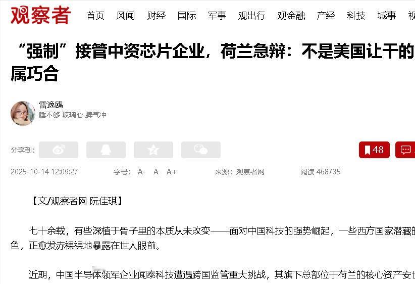 欧洲刚把中资芯片厂强制接管,中国反手就把仓库大门上锁——安世半导体惠州、上海两大基地里价值数亿美元的晶圆、封装件,如今一箱也飞不出保税区。荷兰正连夜跟中方部委商量豁免,语气急得冒烟。 事情的变化其实比很多人预料的还要快。原本这些芯片应该从中国的惠州和上海两地发往全球,但因为中国突然加上了出口门槛,一个许可证让货物动弹不得。 实际上,安世半导体根本不是什么 “欧洲芯片厂”,这是咱们中国企业实打实买下来的资产。2018 年的时候,闻泰科技花了 332 亿人民币,把荷兰恩智浦剥离出来的半导体业务给收购了,之后安世就成了咱们的全资子公司。 这些年咱们经营得好好的,给荷兰交了 1.3 亿欧元的税,还在当地雇了几千人,不管是对荷兰还是对全球供应链,都是做了实事的。 可荷兰政府倒好,9 月底突然翻脸,搬出个冷战时期的《商品供应法》,二话不说就把安世的全球资产给冻了,中方创始人张学政的职务说停就停,99% 的股权都塞给了第三方托管。这哪是什么 “监管”,分明就是明抢! 更可气的是,这背后全是美国在搞鬼。法庭文件都曝光了,早在今年 6 月,美国官员就逼着荷兰表态,说安世想从美国的 “黑名单” 里逃出来,必须把中国籍的 CEO 给换了。 等到 9 月底美国把制裁范围扩大到子公司,荷兰第二天就动手了,这哪是什么 “自主决定”,分明就是美国的跟屁虫,温顺得很。他们嘴上喊着 “保障供应链安全”,实际上就是见不得中资掌控关键芯片企业,想用政治手段抢饭碗。 但荷兰政府千算万算,忘了最关键的一点:安世的命根子在中国。这家公司看着总部在荷兰,可 70% 的产能都扎在中国土地上,广东那 8 万平方米的封装厂,光是年出货量就超过 1100 亿件,全球每 5 个成熟芯片里就有 1 个是这儿造的。 惠州、上海的基地里堆着的那些晶圆、封装件,价值好几亿美元,全是要发往苹果、特斯拉这些大公司的关键货。他们以为抢了总部的控制权就能说了算,殊不知生产的源头、出货的闸门全在咱们手里。 所以中国这反手一锁仓库门,简直是点中了荷兰的死穴。10 月 4 号商务部一发布出口管制公告,安世在中国的工厂就立马停了出口,没有许可证,再好的芯片也别想出保税区。 这一下欧美客户先慌了神,特斯拉的电动车生产线缺了安世的功率半导体就转不动,苹果的新机型也等着芯片装机,这些巨头天天给荷兰政府施压,能不急吗? 要知道,安世的芯片可不是普通玩意儿,汽车的电源管理、手机的传感器都得靠它,断供一天损失都是天文数字。 荷兰这才尝到厉害,之前嘴硬说 “自主决策”,现在连夜派人和中方部委求豁免,语气急得冒烟。他们心里比谁都清楚,真把中国惹毛了,吃亏的还是欧洲自己。 安世在欧洲的工厂虽然雇了人,但原材料、核心工艺都离不开中国供应链,咱们要是再收紧点,不光是安世,连带着欧洲的汽车产业都得跟着遭殃。 更别说中国手里还有镓、锗这些半导体必备材料的王牌,全球 90% 以上的产量都在咱们这儿,真要是限制出口,整个西方半导体行业都得抖三抖。 有人可能会问,咱们这么做会不会太强硬?其实这都是被逼出来的。这些年美西方打压中国科技企业就没停过,从华为到中兴,现在又轮到安世,动不动就拿 “国家安全” 当借口,把商业规则踩在脚下。但他们忘了,中国早就不是以前那个任人拿捏的样子了。 就像这次,荷兰刚动手三天咱们就反制,速度快得让他们措手不及,这背后是咱们对供应链的掌控力,更是自主技术的底气。最近国产 EDA 设计软件都突破了,这些硬实力就是咱们说话的本钱。 中国欧盟商会都看不过去了,说荷兰这是 “现代经济强盗行径”,这话一点没说错。你想想,人家合法收购的企业,好好经营着,凭什么说接管就接管? 要是每个国家都学荷兰这样,看谁的企业好就抢过来,那全球生意还怎么做?咱们锁仓库门,不是要撕破脸,而是要告诉他们:合作可以,但得讲规矩,想明抢?没门! 现在这局面其实很清楚,荷兰要么撤销错误决定,把安世的控制权还给闻泰科技,要么就等着供应链彻底乱套。 那些喊着 “技术主权” 的欧洲政客也该醒醒了,全球产业链早就你中有我、我中有你,想把中国踢出去,最后只会砸了自己的饭碗。中国从来不怕博弈,但也珍惜合作,可合作的前提是相互尊重,不是单方面的欺负人。 说到底,安世这事儿就是个教训,告诉美西方:别把中国的克制当软弱,也别把商业当政治游戏。咱们能把仓库门关上,也能在需要的时候打开,但钥匙攥在自己手里,想拿钥匙,就得拿出诚意来。荷兰现在急着求豁免,就是明白这个道理了,可惜早干嘛去了?