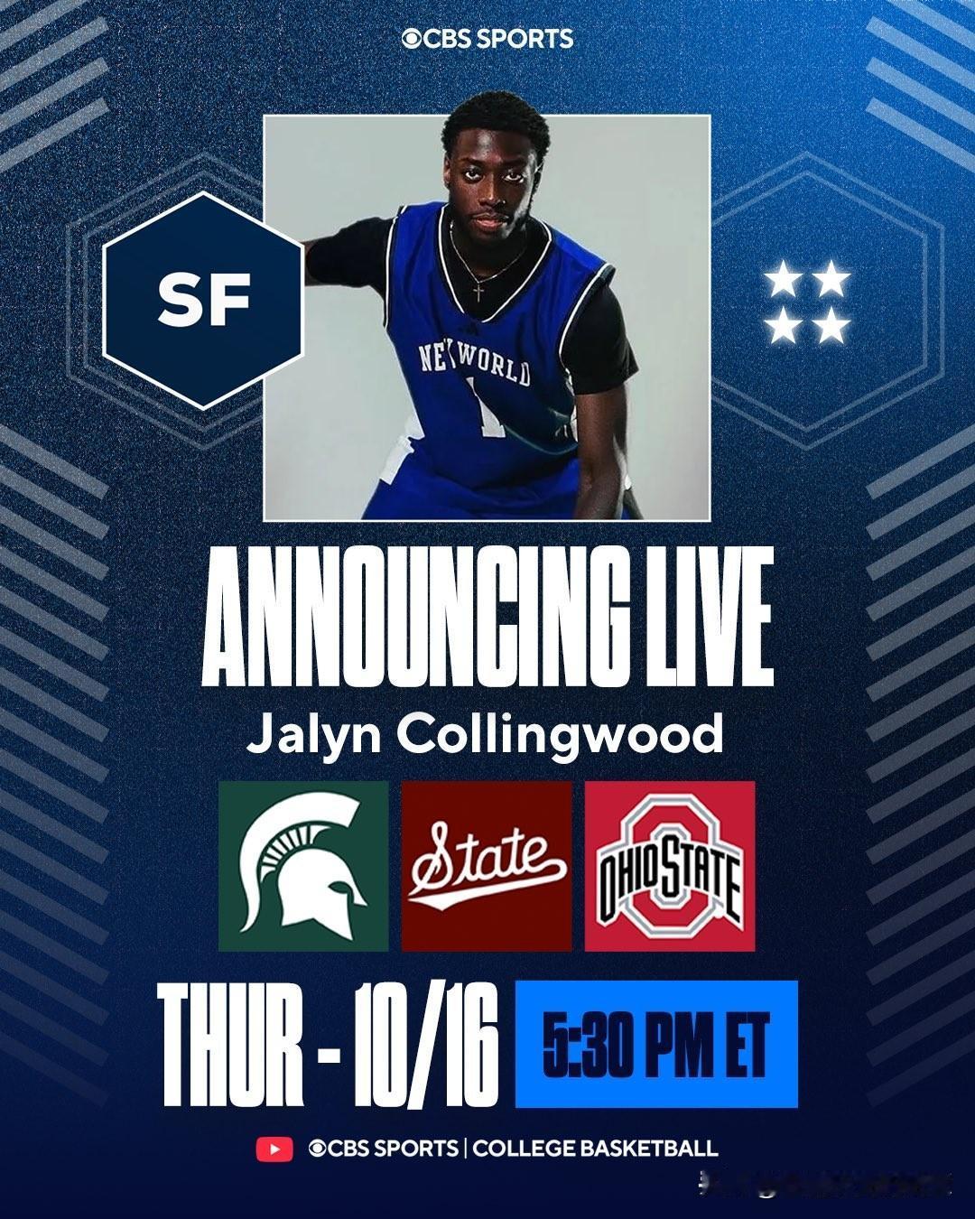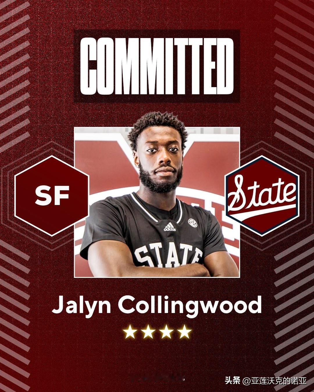 四星前锋Jalyn Collingwood宣布承诺NCAA男篮 密西西比州立,身高6-5=196,高四赛季就读于华盛顿特区Sidwell Friends,选择这里是因为教练组对我的爱,更重要的是主帅Chris Jans对我的关注。球队这届收到第三位加盟者,之前还有Willie Burnett III与Ladarius Givan。