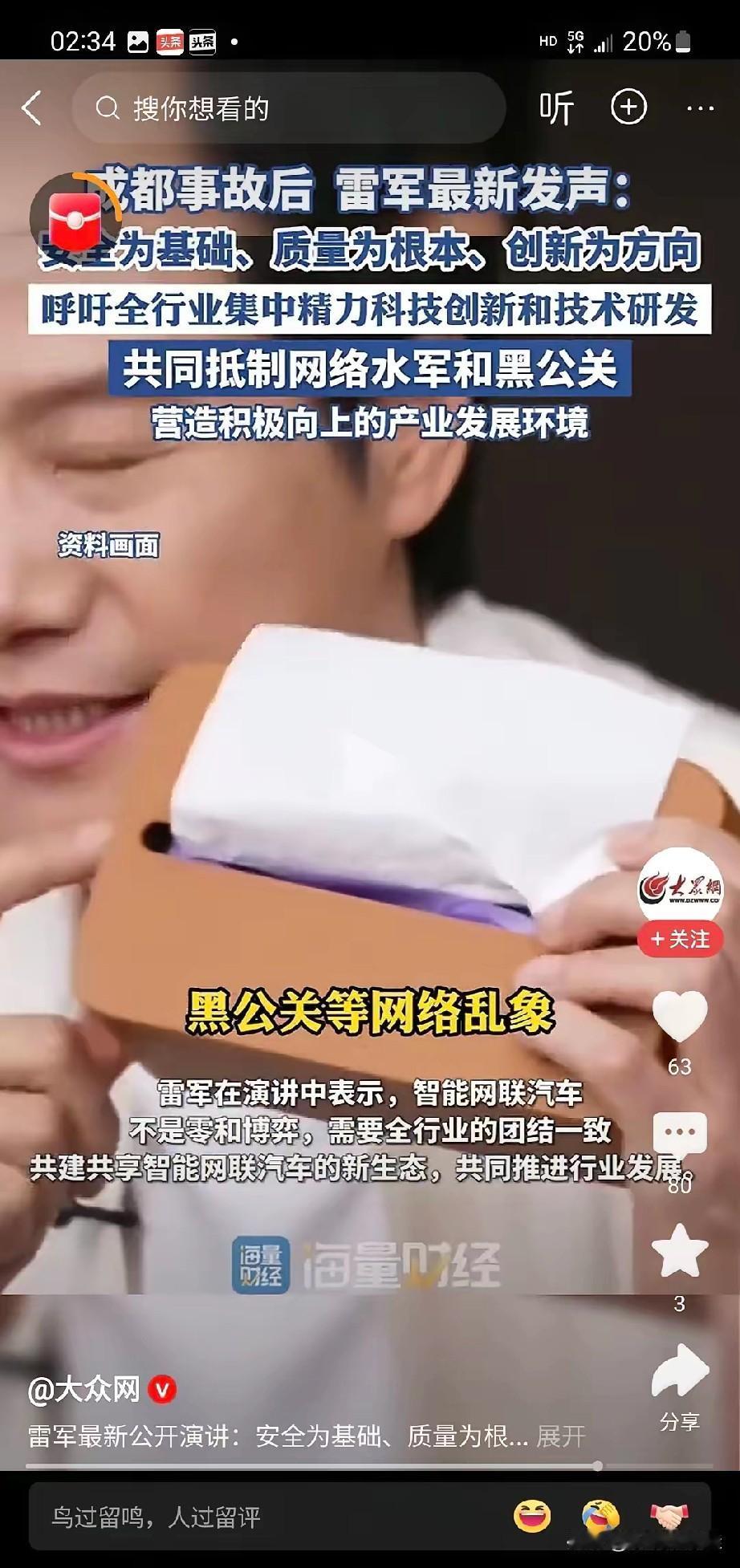55岁的雷军 给所有企业家提了个醒 不是因为演讲不够精彩,也不是因为产品不够创新,而是当用户拿着放大镜看你时,每一句口号都可能成为扎向自己的刺。 10月16日的行业大会上,他七次强调安全,五次呼吁创新,倡议抵制网络水军。台下的人却想起三天前成都事故里那扇打不开的车门。他的抖音账号一个月掉了35万粉丝,评论区挤满了等待提车和质疑车门的人。 产品召回、交付延期、宣传话术被逐字解读,信任消耗后,情怀再也撑不起期待。企业家站在光环里太久,容易忘了舞台之下,皆是现实。
