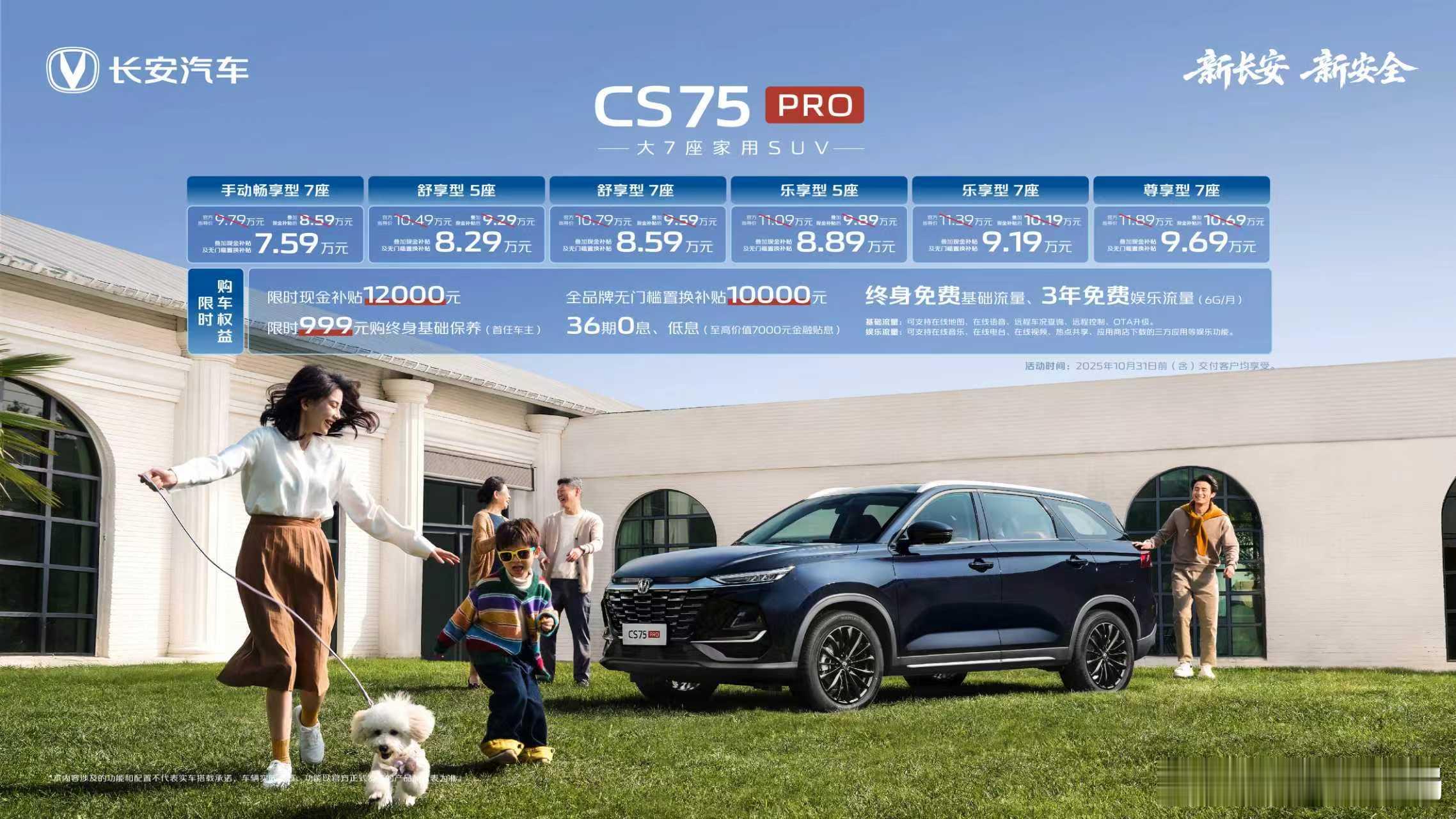 新车划重点新车情报局 刚刚长安CS75PRO宣布上市,新车提供5座和7座两种座椅布局可选,根据配置共推出6款车型,官方指导价9.79万元-11.89万元,叠加现金补贴及无门槛置换补贴后为7.59万元-9.69万元。