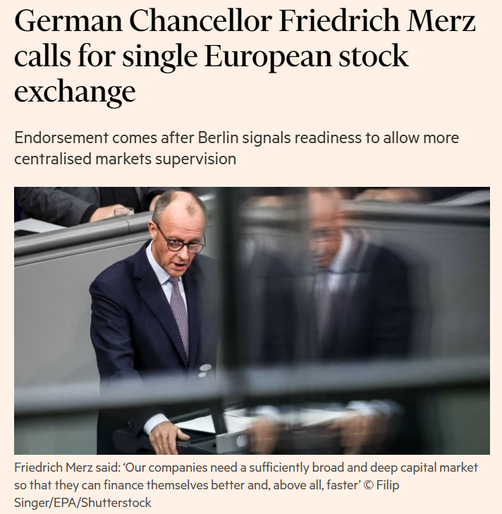 德国总理梅尔茨呼吁建立单一的欧洲证券交易所,表明德国支持统一欧盟资本市场的计划。