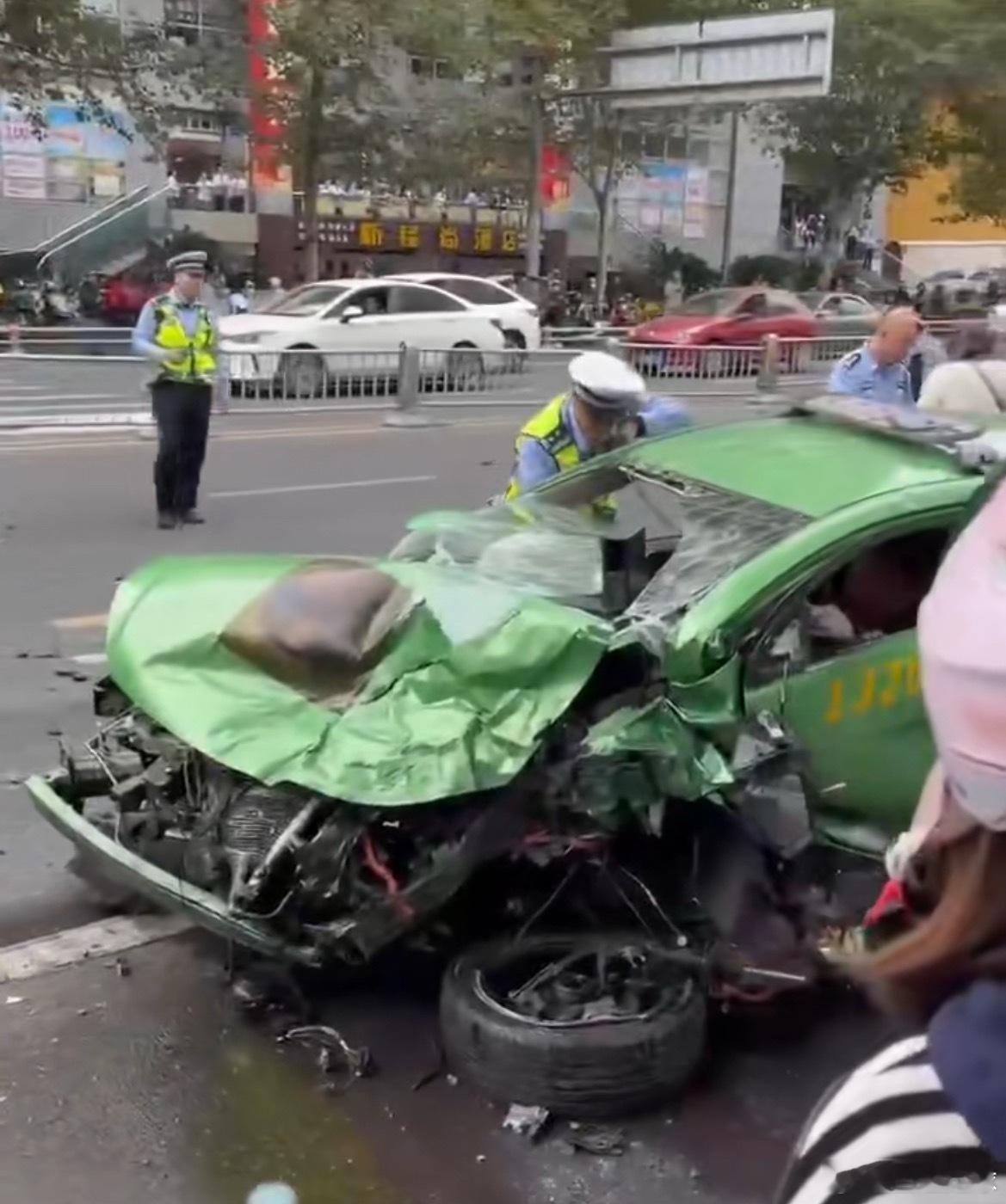 挨着文殊院的草市街发生一起车祸,肇事的越野车逆行连撞好了几辆车,护栏被撞其中一辆出租车被撞得报废,司机看样子受伤很严重。