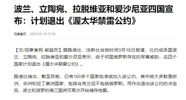 [微风]立陶宛退出!拉脱维亚退出!爱沙尼亚退出!波兰和芬兰也退出!乌克兰也退出了! 东欧五个挨着俄罗斯的国家,全都要退出《渥太华禁雷公约》,意思就是以后又能在自家边境埋地雷了,跟俄罗斯对着干的劲儿一下就拉满了! 这事儿可不是一时冲动。就在6月27号,立陶宛、拉脱维亚和爱沙尼亚这三个波罗的海国家,齐刷刷地向联合国提交了退约文件,按照规定,六个月后他们就正式自由了。 芬兰和波兰也没落下,议会已经批准,流程走得飞快。乌克兰更干脆,总统泽连斯基6月底签了令,7月中旬议会就拍板通过,理由是俄罗斯压根没签这个公约,乌克兰不能单方面束手束脚。这一连串的动作,背后打的算盘其实很清晰。 最直接的理由,就是“怕了”。这些国家都跟俄罗斯接壤,看着乌克兰的战火,心里能不慌吗?他们公开发表的声明里,话都差不多,就是说俄罗斯带来的军事威胁显著增加了,必须给国防部队“提供灵活性和选择自由”,好加强北约东部这条脆弱的侧翼。 立陶宛外长说得更是直白,普京的俄罗斯是欧洲长期存在的最大威胁,所以得采取一切必要手段保护每一寸土地。说白了,就是觉得光靠公约的道德约束,挡不住坦克,得来点硬的。 但光有决心还不够,地雷这东西在军事上确实有它独特的“魅力”。现代战争打的是钱,一枚精确制导炮弹可能要三千多欧元,而一枚所谓的“智能地雷”成本只有三百到六百欧元。对于已经把国防开支提到GDP占比5%的这些国家来说,这性价比太高了。 有研究机构评估过,同样长度的防线,如果布上雷场,能让进攻方的损失率暴增三到五倍,还能为防御方争取到一周多的宝贵时间来调动部队。面对俄罗斯那超过两千六百万枚的地雷库存,东欧国家觉得再自我禁令,简直就是单方面解除武装。 所以,他们退约可不是说说而已,而是真金白银地准备干。立陶宛已经把八千万欧元划进2026年的预算,准备新建生产线,目标是储备数十万枚地雷。 芬兰更是在一个总额高达三十七亿欧元的国防现代化计划里,把地雷项目放了进去。波兰的军备集团更是放话,必要时能生产数百万枚。从芬兰的拉普兰到波兰的东部边境,一道由地雷构成的“新铁幕”似乎正在酝酿之中。 然而,地雷这东西,从来都是一把双刃剑。它在战场上能挡住敌人,也能在和平年代成为平民的噩梦。统计数据显示,全球每年因地雷伤亡的人里,超过八成是平民,其中一半以上是孩子。 战后排雷更是个无底洞,每平方公里的雷区,清除费用可能高达百万美元,而且往往要拖上十几年。 这些国家也考虑到了这一点,所以他们打算用技术来“美化”地雷,比如给地雷装上自毁装置,设定几十小时后自动失效,或者用远程信号统一控制雷场的开关。但技术真的能万无一失吗?那百分之二的故障率,在广袤的边境线上,又意味着多少潜在的危险呢? 这一系列操作,已经在国际舞台上激起了涟漪。克里姆林宫痛斥这是“新法西斯主义布雷计划”,并扬言要对等反制。 而在北约内部,德国、法国等西欧国家依然坚守公约,这无疑造成了联盟内部的裂痕。当生存的焦虑压倒人道的考量,当现实的威胁挑战既定的规则,欧洲的安全格局似乎正在倒退回那个最原始、最残酷的现实主义轨道。 这种以安全为名的选择,究竟是明智的自保,还是打开了潘多拉的魔盒?当“智能地雷”与无人机、火炮系统结合,未来的战场会变成什么样子?欧洲的未来,会因此更安全,还是更危险?你的看法呢?