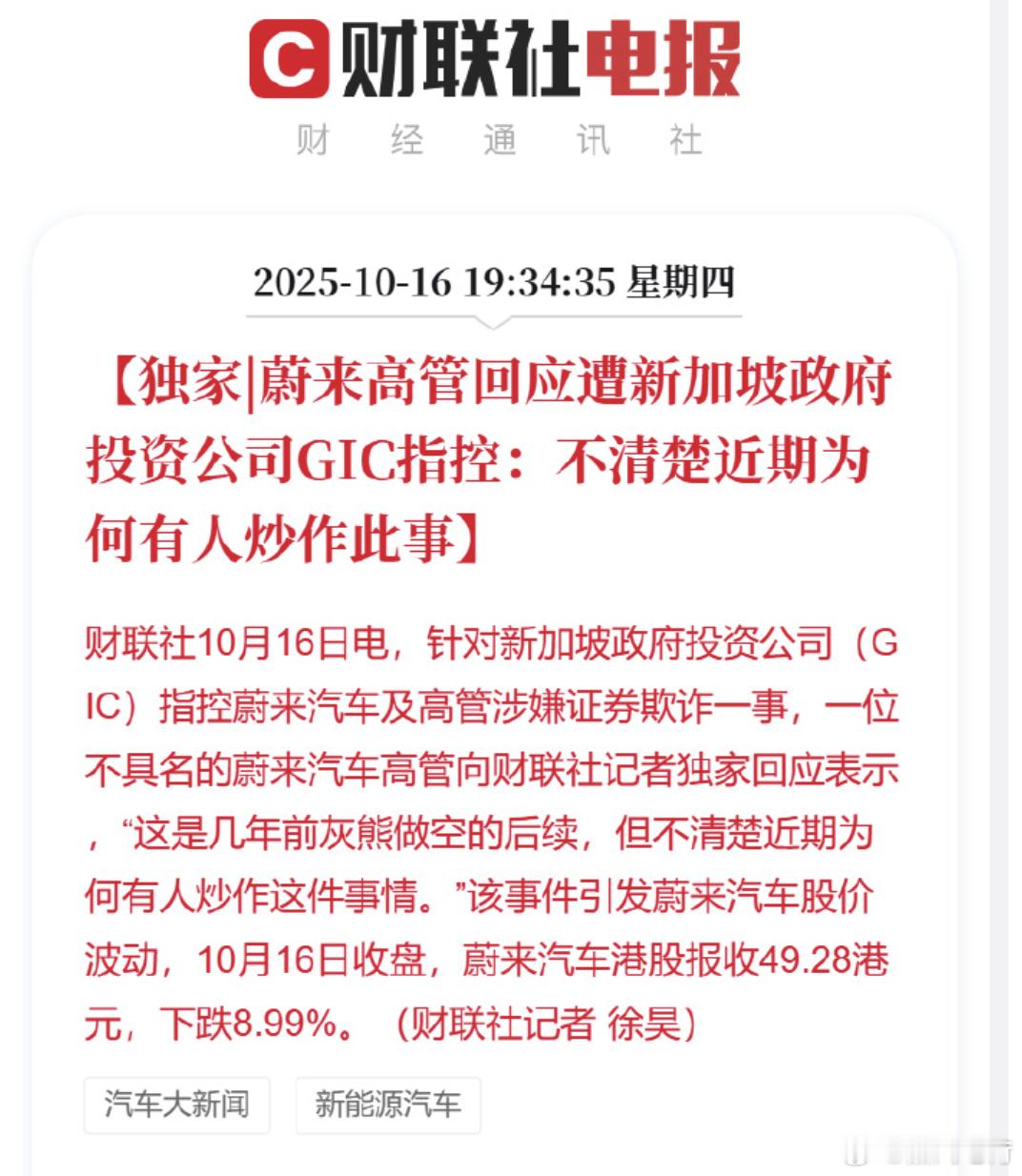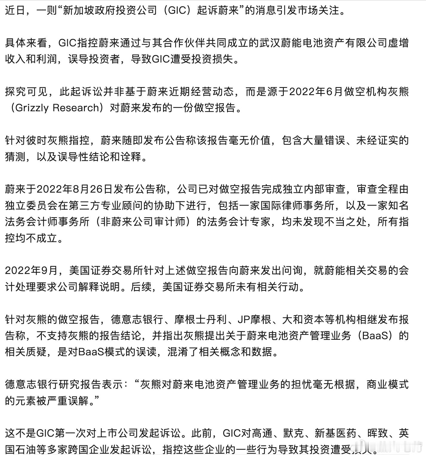 新加坡政府投资公司GIC起诉蔚来这事,源于一个旧闻,不是新闻。蔚来之前曾经回应过