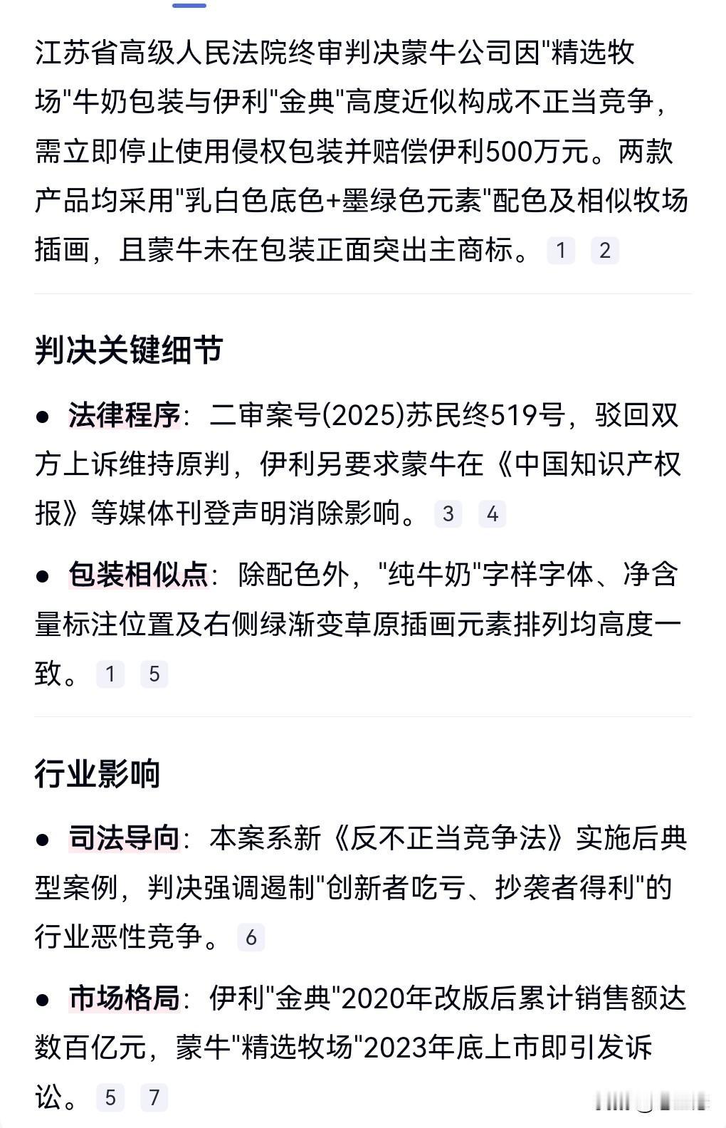 这真是敲响的警钟啊。 做企业一定老老实实要有自己的创意,不能够借鉴或抄袭别人的东西。 10月17日,在网上看到这么个消息,蒙牛包装“撞脸”伊利,被判赔500万。 这也是为维护伊利的正当权益。 现在这年头越来越不能走捷径了,一定要有自己的东西。