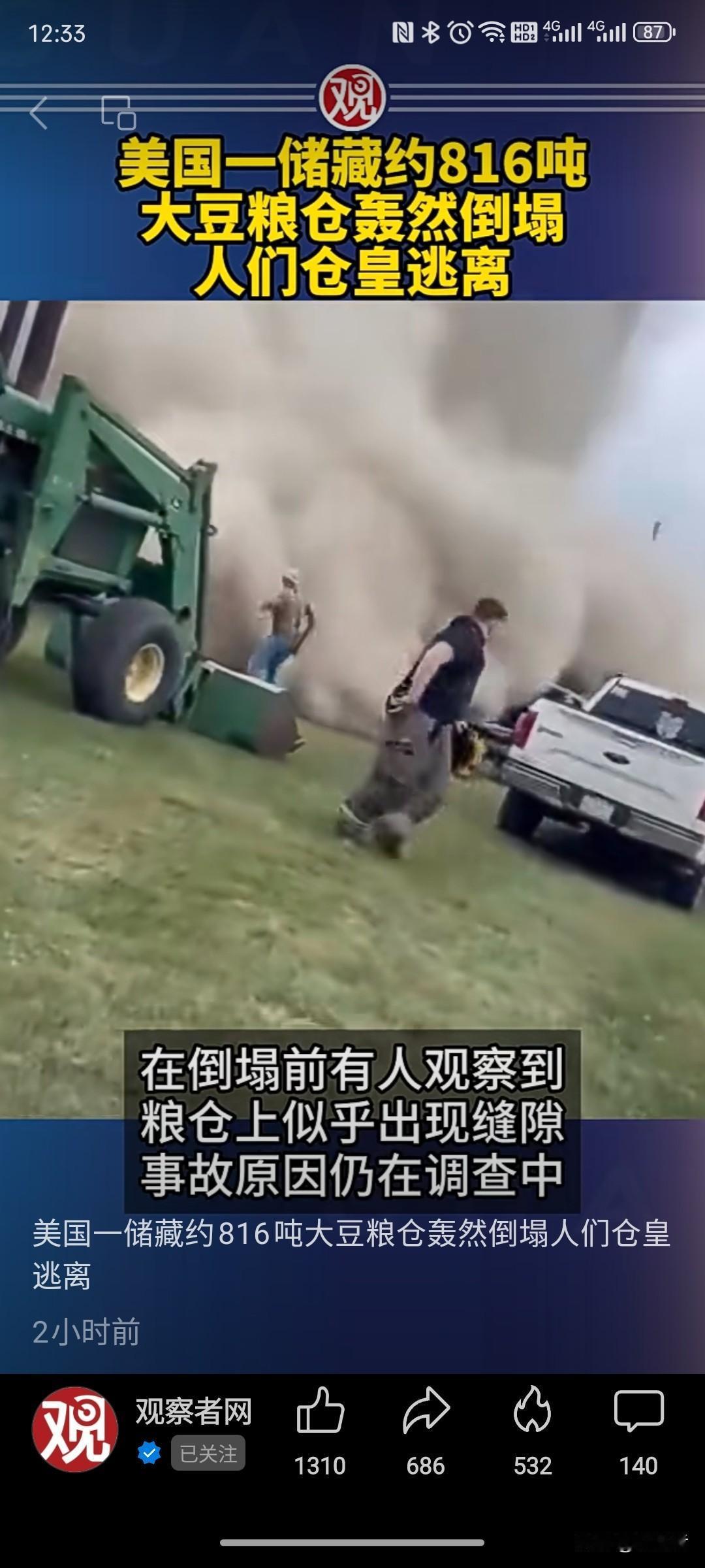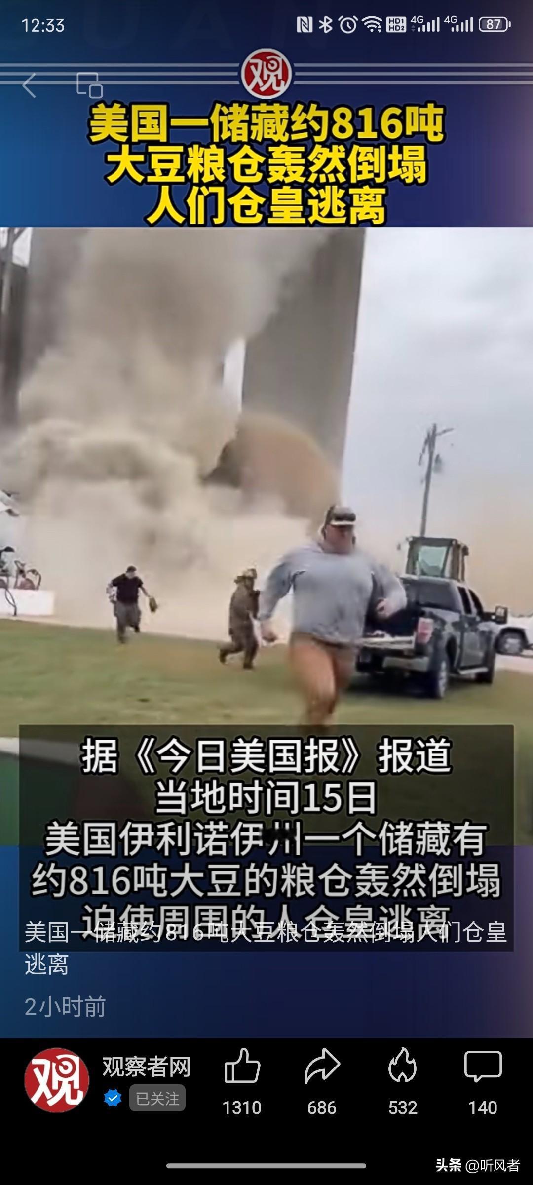 美国那边又出大事儿了,听说有个装着大约816吨大豆的粮仓,“轰”的一下就倒塌了!