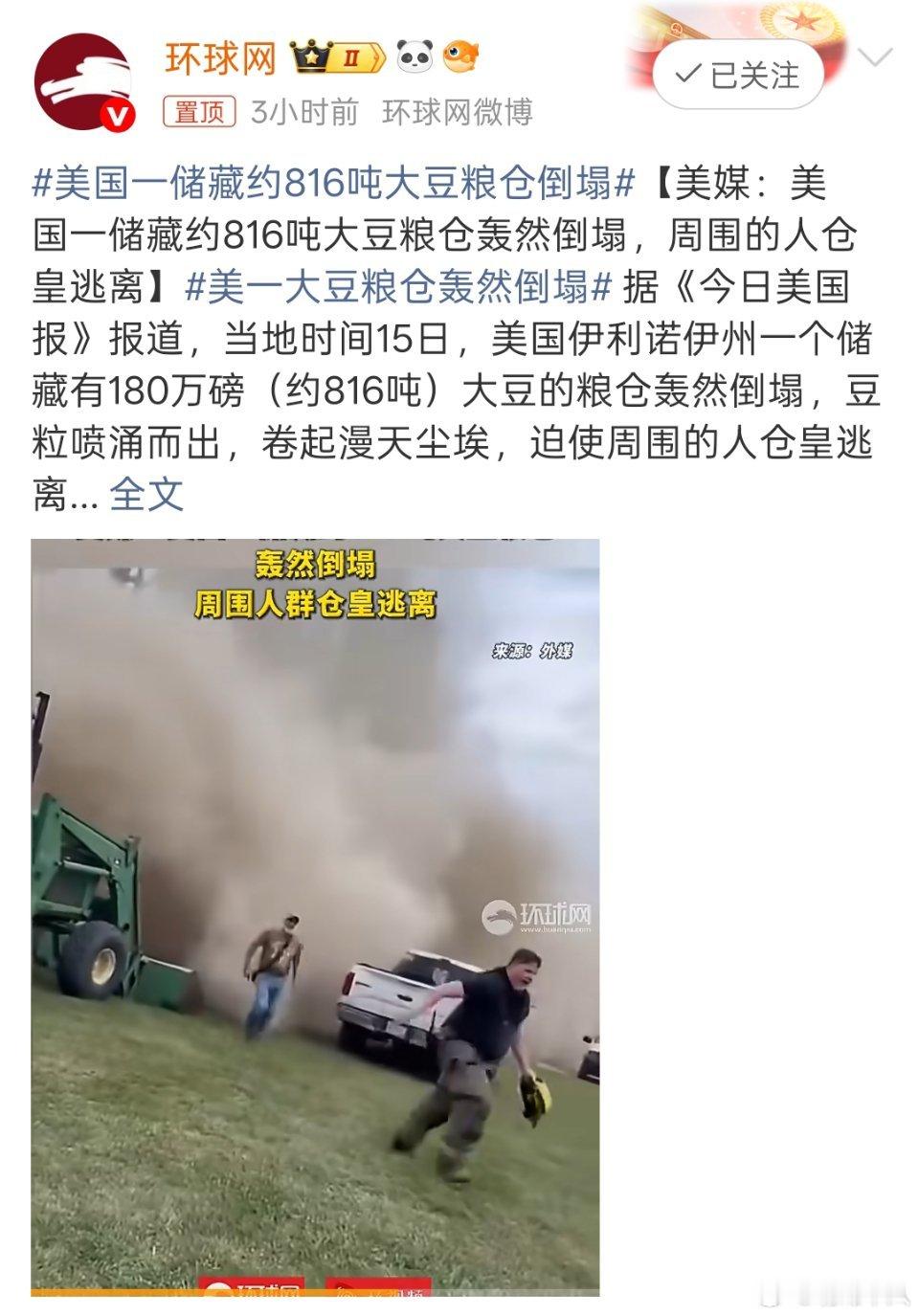 美国一储藏约816吨大豆粮仓倒塌美国前两天炸药工厂爆炸,今天又有大豆粮仓倒塌,史