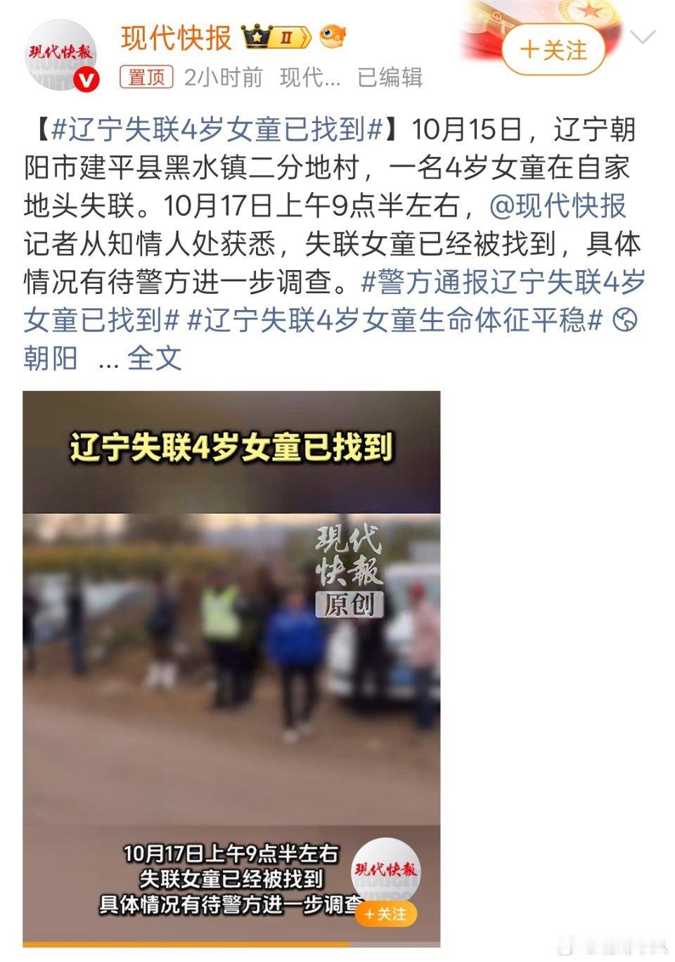 辽宁失联4岁女童已找到太好了!经过2天的搜寻,孩子已经找到,生命体征平稳,大家担