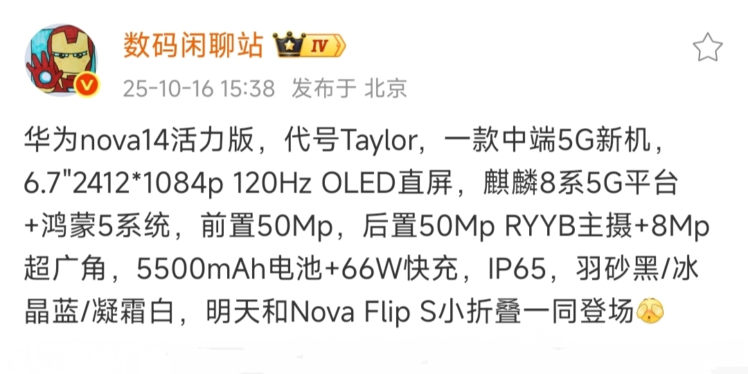 华为 Nova14活力版正式开启预售,2199元起,虽然官方还没有公布配置信息,但是有些数码博主已经爆料了一些硬件配置。Nova14活力版采用的是麒麟8系5G平台,一块6.7英寸1080P分辨率直屏,拍照方面后置5000万像素,电池配置给到了5500mAh电池加66W的有线充电。
