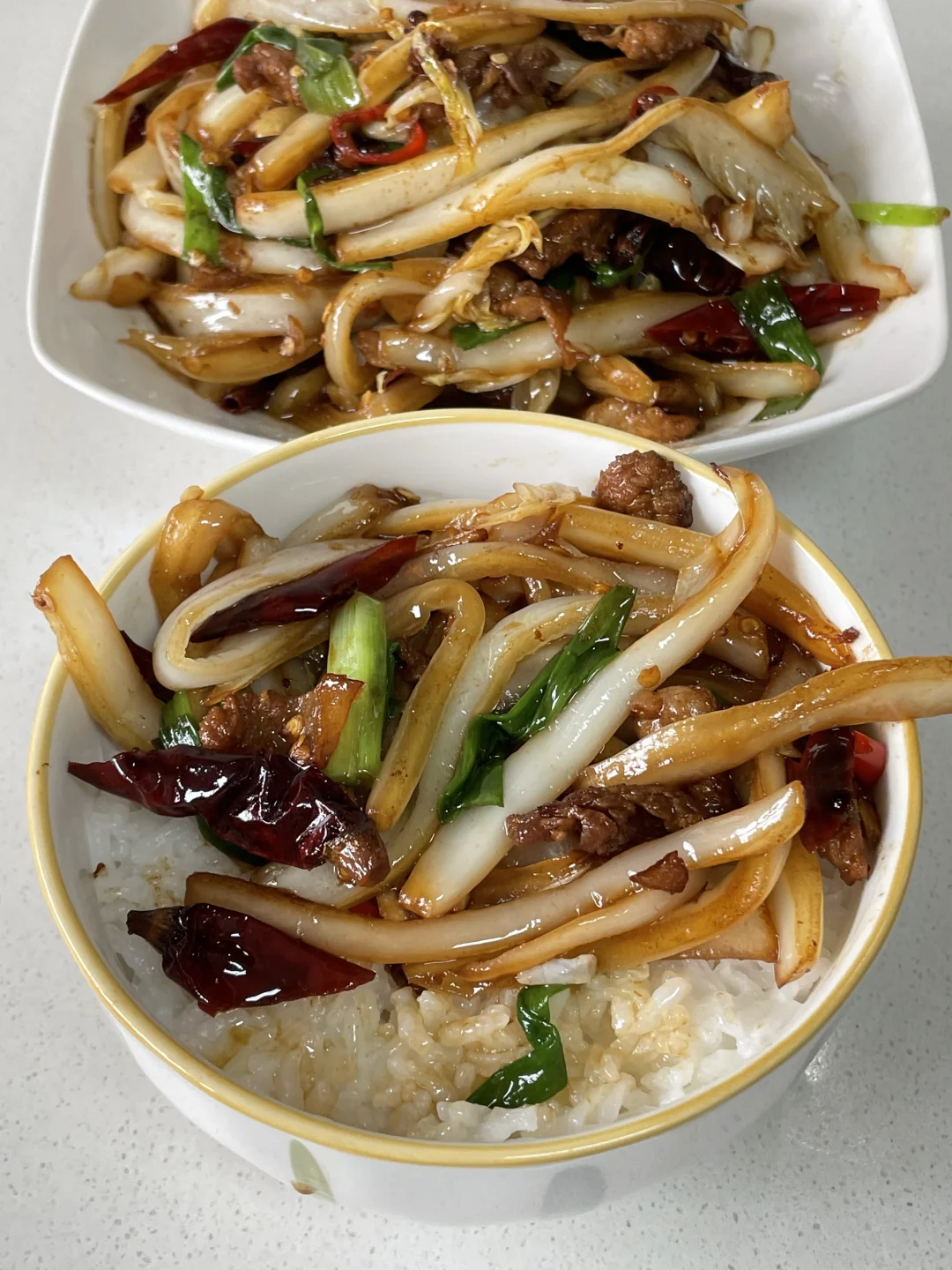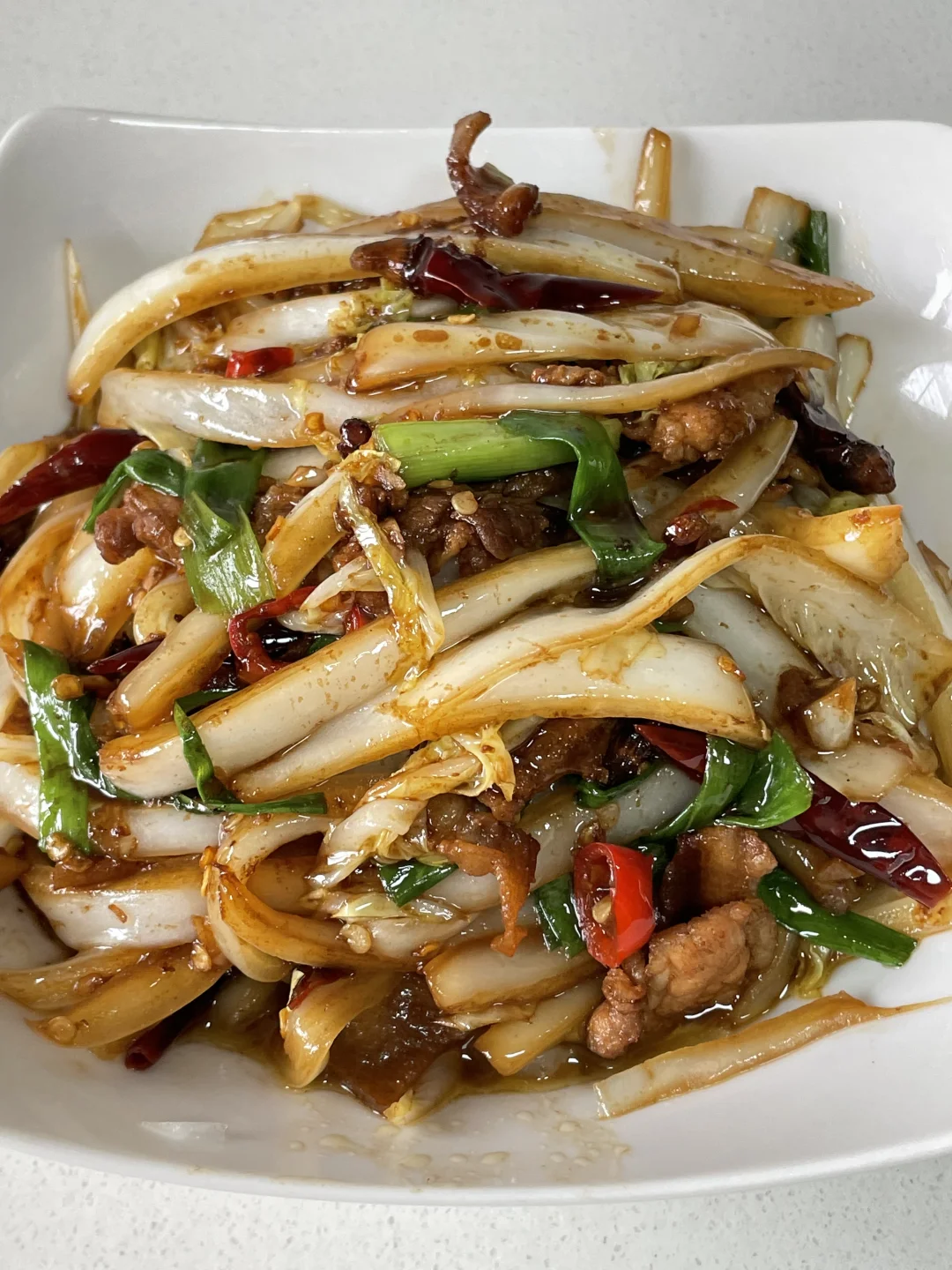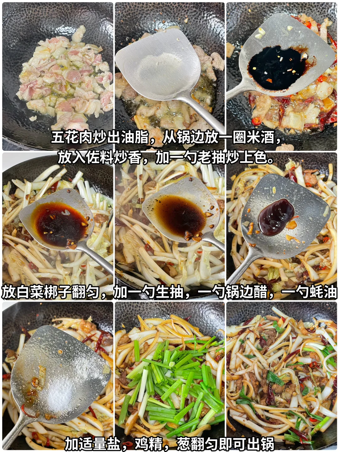 2⃣️起锅烧油,油热将五花肉。再加几粒花椒煸炒出油脂,从锅边来一圈米酒炒香,再放入干辣椒、小米辣和蒜炒出香味。加入小半勺老抽炒上色,然后放入白菜梆子翻匀炒断生,加入一勺生抽,从锅边来一圈锅边醋,然后一勺蚝油,适量的盐鸡精,再加入葱段翻匀即可出锅,这样做出来的醋溜白菜帮子真的巨好吃,喜欢的姐妹试试吧。