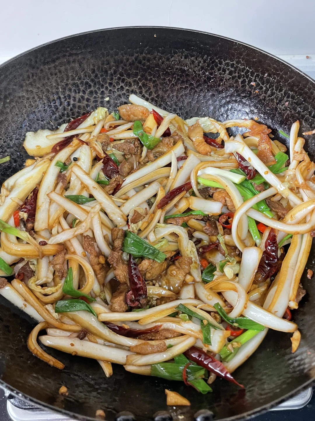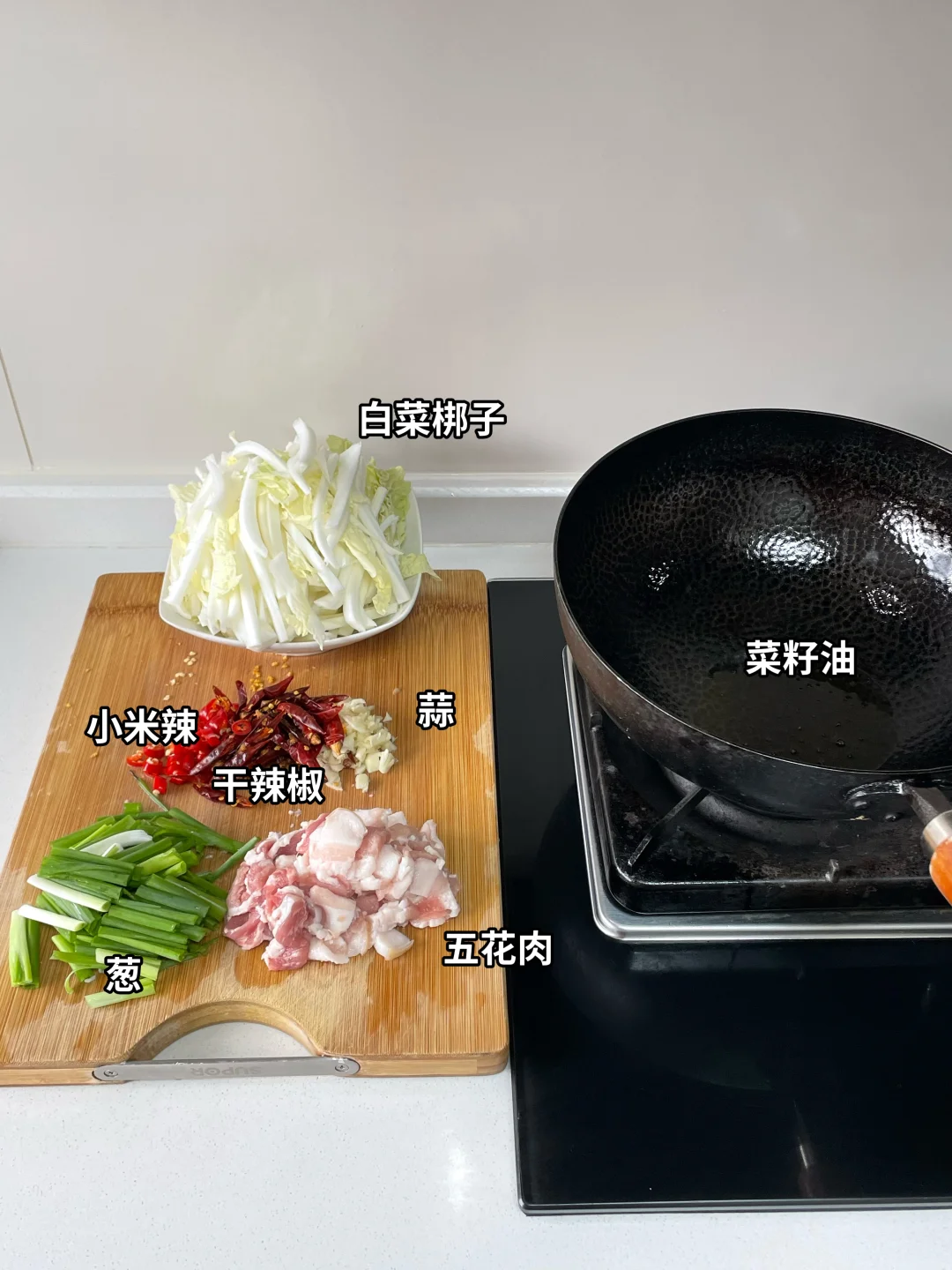 1⃣️准备一些五花肉切片,白菜帮子切条,再来一些蒜,干辣椒、小米辣葱切段。