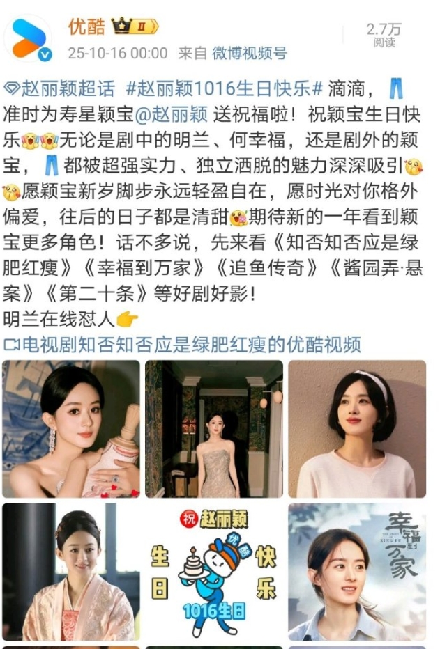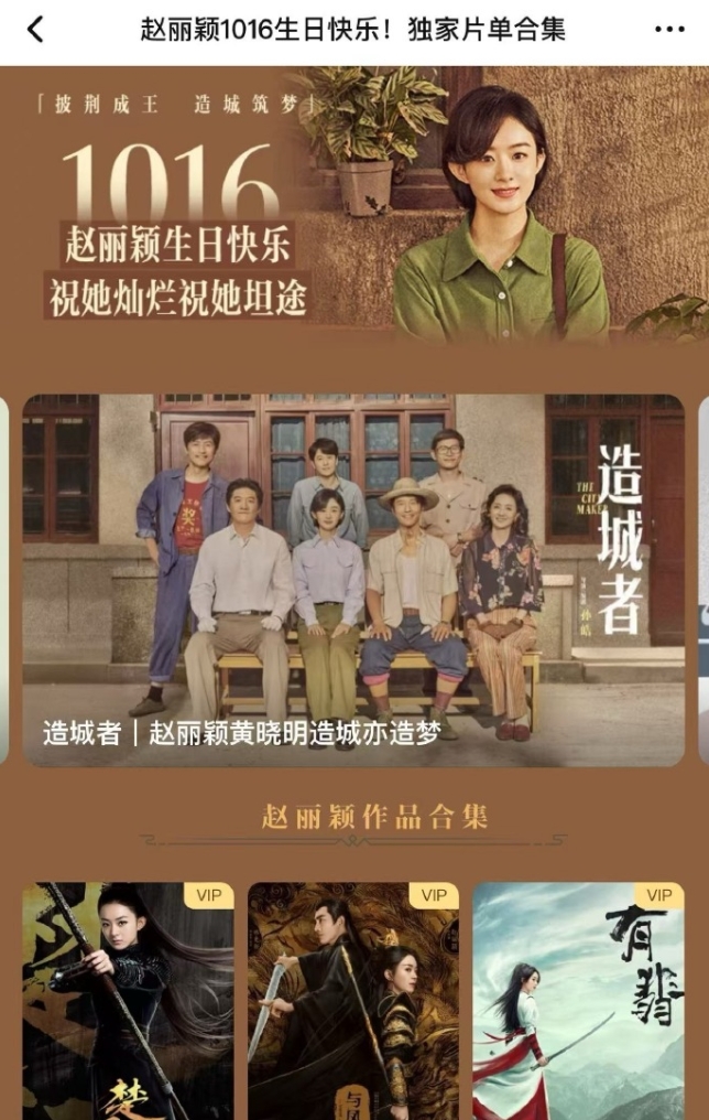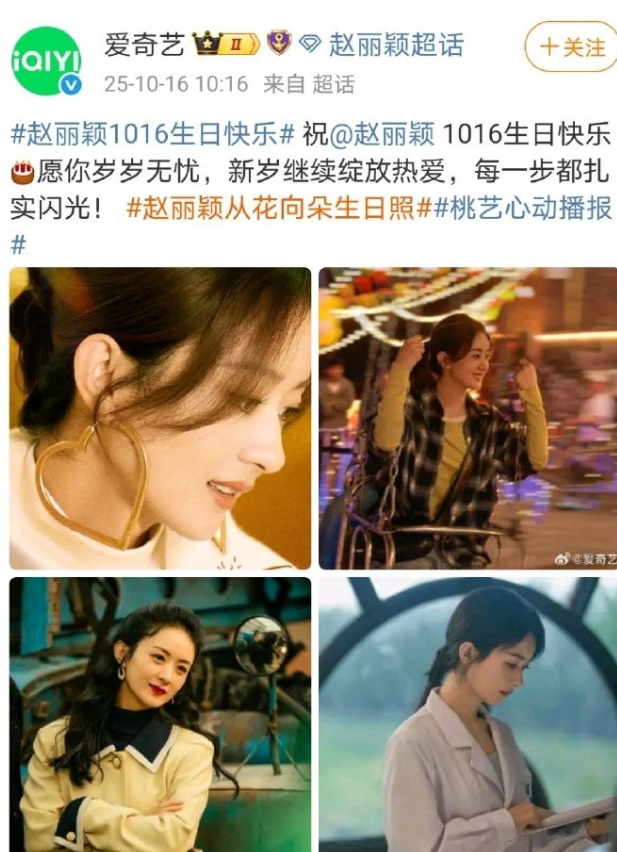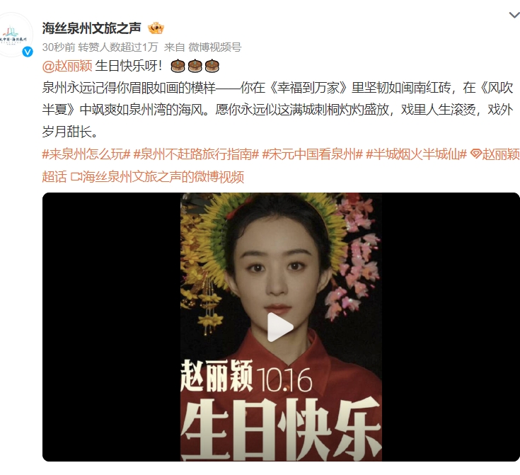 她自己挺低调的,但是爱优腾三大视频平台掐点给她庆祝生日,湖南卫视连发11条动态为她庆生,腾讯视频给她设置了生日专栏,泉州文旅发视频给她庆生,科兰黎包下上海外滩户外大屏为她庆生,而且线下店铺所有LED都换成了赵丽颖生日快乐,平台是因为作品,文旅是因为她靠个人影响力带火了簪花围,靠实力赢的的祝福。