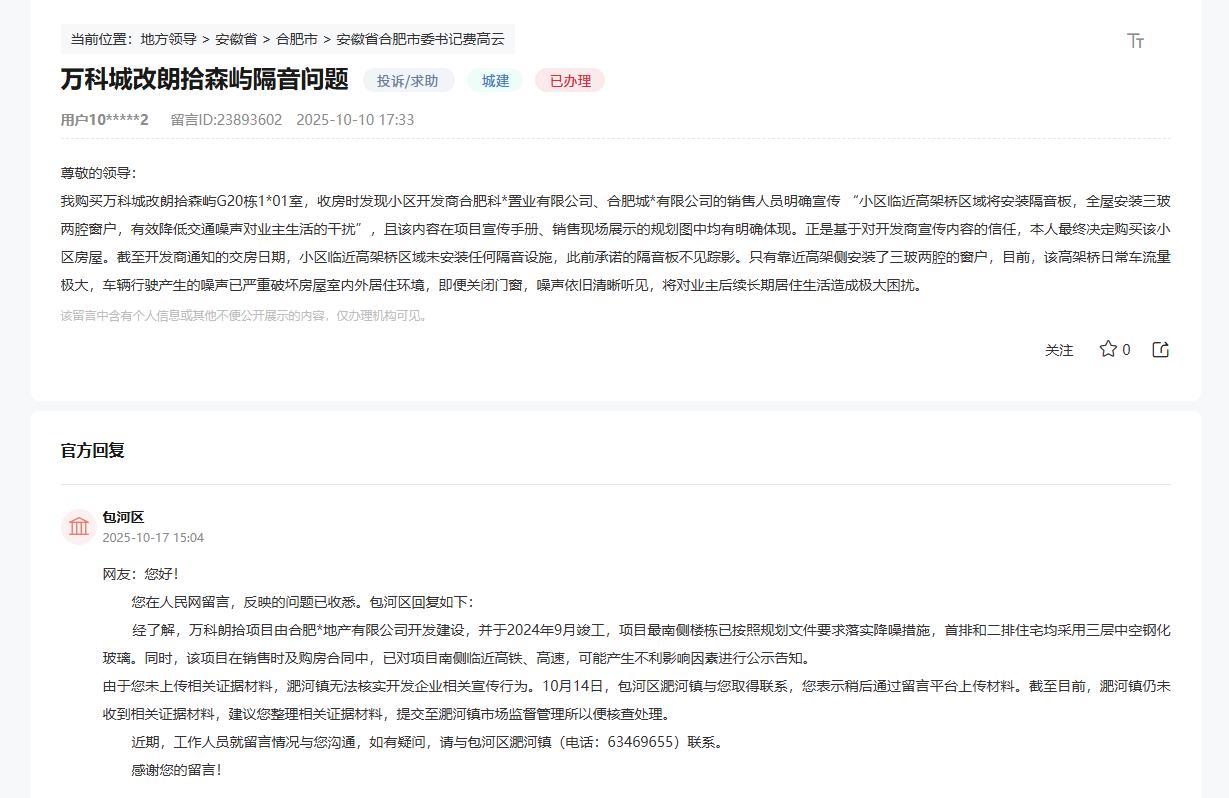 高架,铁路,高速公路的旁边的房子,明明知道了,看到了,还要去买。现在来投诉,这种真行不通。 万科城改朗拾森屿隔音问题,该高架桥日常车流量极大,车辆行驶产生的噪声已严重破坏房屋室内外居住环境,即便关闭门窗,噪声依旧清晰听见,将对业主后续长期居住生活造成极大困扰。