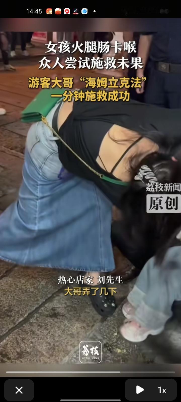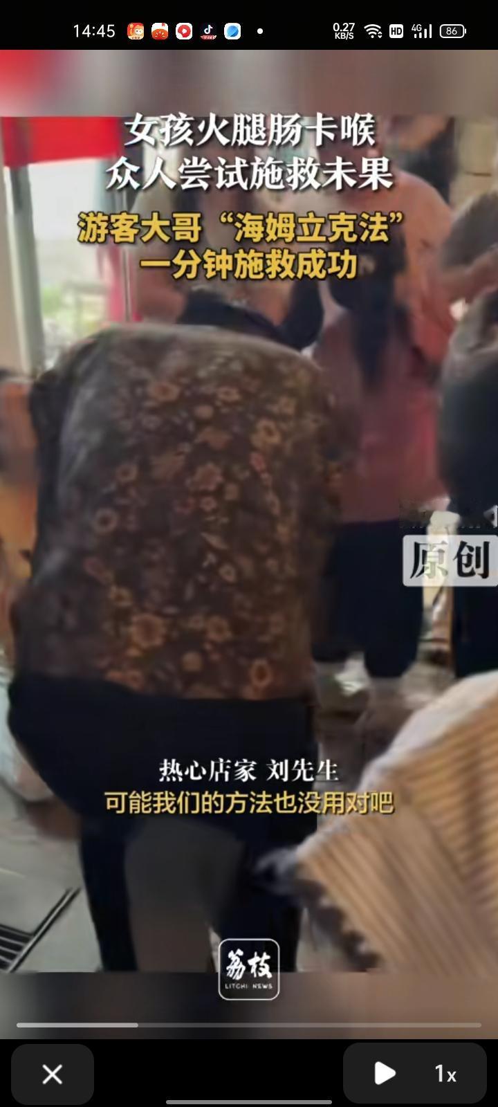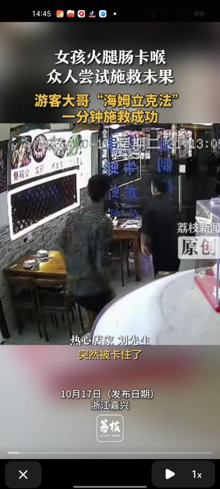 10月15日,嘉兴市嘉善县。女孩吃火腿肠时被噎住,生命危在旦夕,商家、保安上前帮忙,结果两三分钟没有吧女孩嘴里的东西弄出来。就在这时,餐馆老板抱着试一试的心态,问店里的顾客会不会海姆立克急救法,大哥和朋友蹭一下就出去救人,弄了几下东西就慢慢出来了。