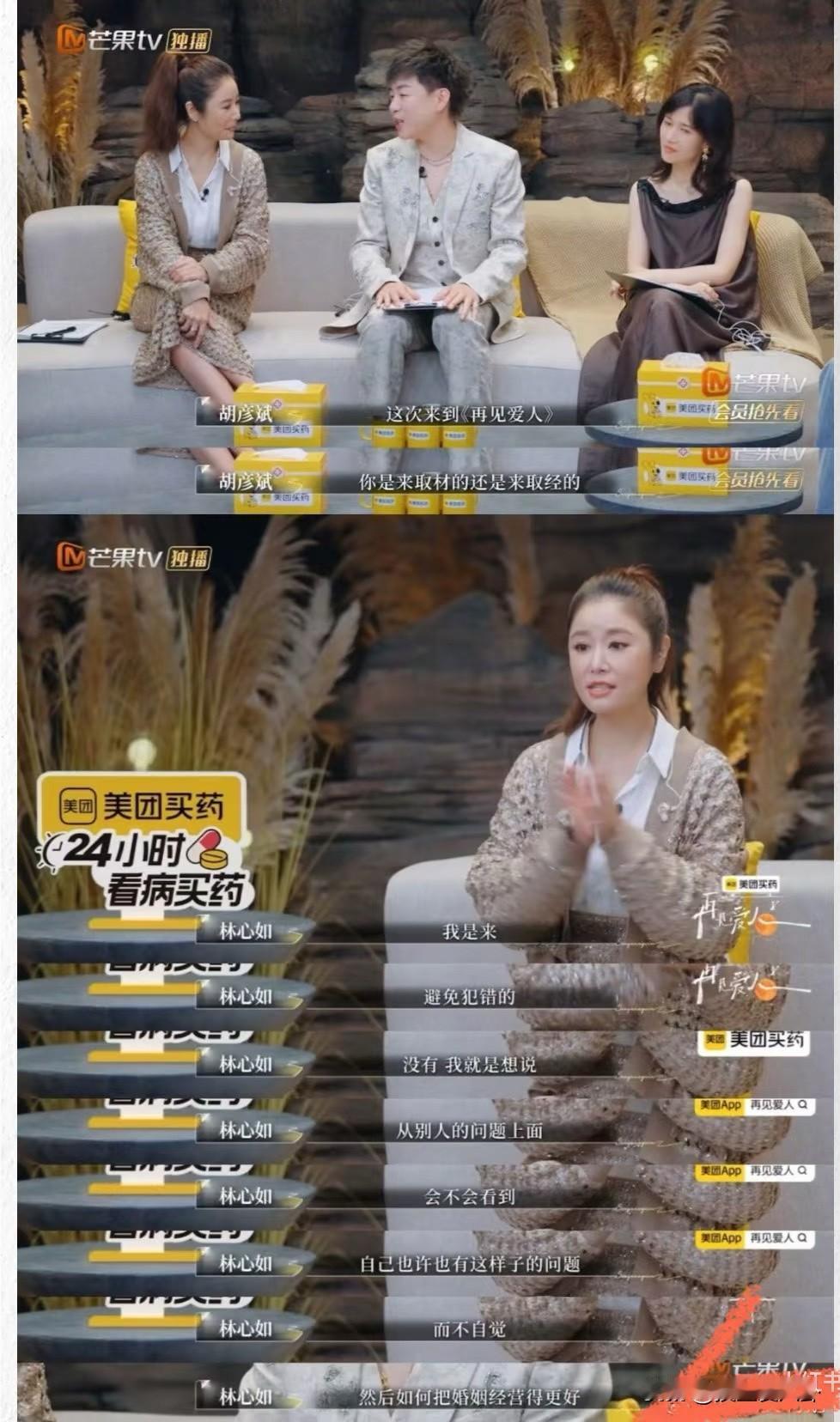 你们都不要被林心如骗了 她说来上再见爱人是为了把婚姻经营的更好, 但其实她就是来取经取材的,不是为了影视剧而是综艺。 林心如说她想从别人的问题上看一看自己是否也有,避免犯错,但其实她婚姻家庭美满。 这些年她转到幕后,作为制片人出品的电视剧既有收视率又有奖,可以说无论是演员还是制作人她都很成功。 而且她一个事业狂,总是勇于挑战自我,那么她给自己的新挑战可能就是做综艺。 所以,她来爆火的再见爱人当嘉宾,既可以拿钱,还可以为电视剧创作积累素材,还能学习怎么制作综艺,三赢!