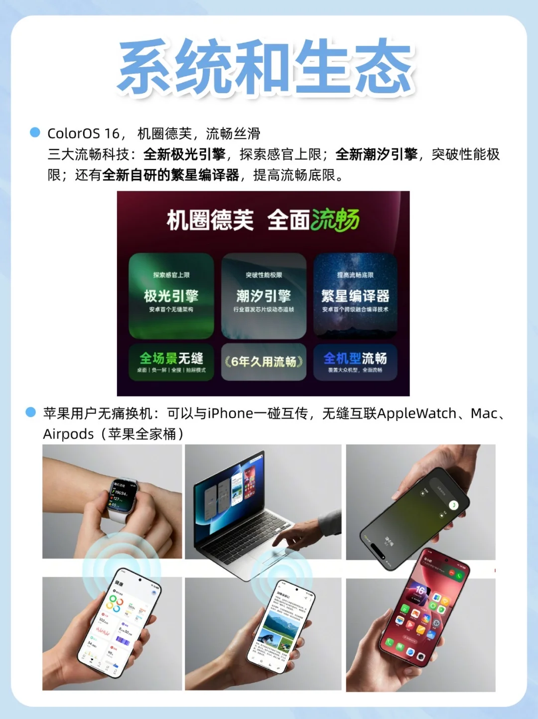 搭载机圈德芙ColorOS 16,日常使用流畅到飞起,带来了全新光场设计,更灵动更有层次。AI一键闪记非常好用,能记视频、账单、图片和语音,可以和iPhone一碰互传,还能连接AppleWatch、Mac、Airpods