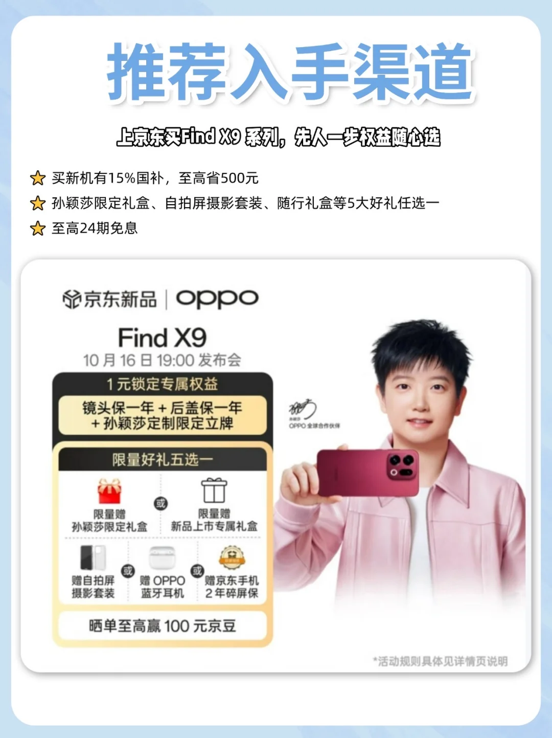 上京东买Find X9 系列,先人一步权益随心选,还有代言人莎莎的礼盒:
