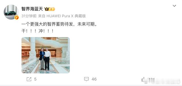 尹同跃与任正非同框刚刚,智界产品总监发布了奇瑞董事长尹同跃与华为创始人任正非的合影,两个公司大佬同框,看来要搞大动作啊。会不会是智界也要搞9字辈车型了?期待一波~