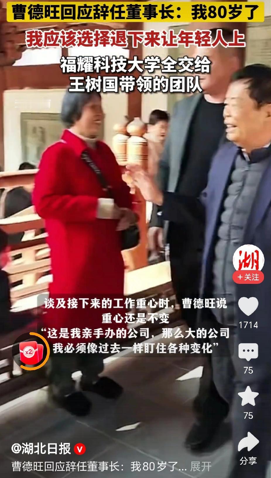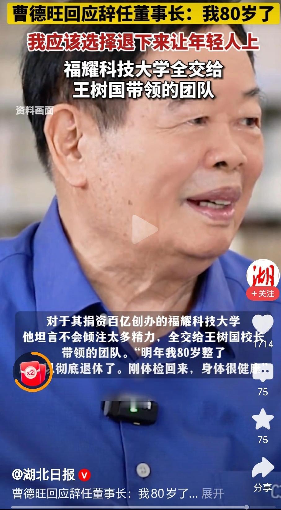 “交班了,80岁的曹德旺将企业交给了55岁长子曹晖!”近日,福建福耀玻璃发布公告,选举曹晖为福耀玻璃董事会董事长,这家广受关注的大企业顺利完成了交班!(来源:@湖北日报) 据视频报道,10月16日,福耀玻璃发布公告,曹德旺向公司提交了辞去公司董事长职务的报告,公司董事局已审议通过,并选举曹晖为公司第十一届董事局董事长。 “我80岁了,我应该选择退下来,让年轻人上!”曹德旺回应为什么辞职时说,“我刚体检回来,身体还很健康,这个时候选择退下来比较好!” “对于投资上百亿的福耀大学,完全交给王树国校长带领的团队。”曹旺德说,我不会倾注太多的精力! “接下来,我工作的重心还是不变,这是我亲手创办的公司,这么大的公司,我还是会像过去一样,盯着各种变化!”曹旺德说,他接下来主要是盯住公司发展的变化上。 福耀玻璃还是一家很有责任感的好企业,利润大,员工多,平常对社会的贡献也非常大。曹德旺先生也是一个非常有爱心的企业家,经常是爱心捐赠的带头人。 希望这次交班能够让企业更上层楼,取得更大的成就! 对此,你的看法是怎样的呢? 福耀玻璃:曹德旺辞去董事长职务 @秋实99 关注人生冷暖,拥抱幸福生活!