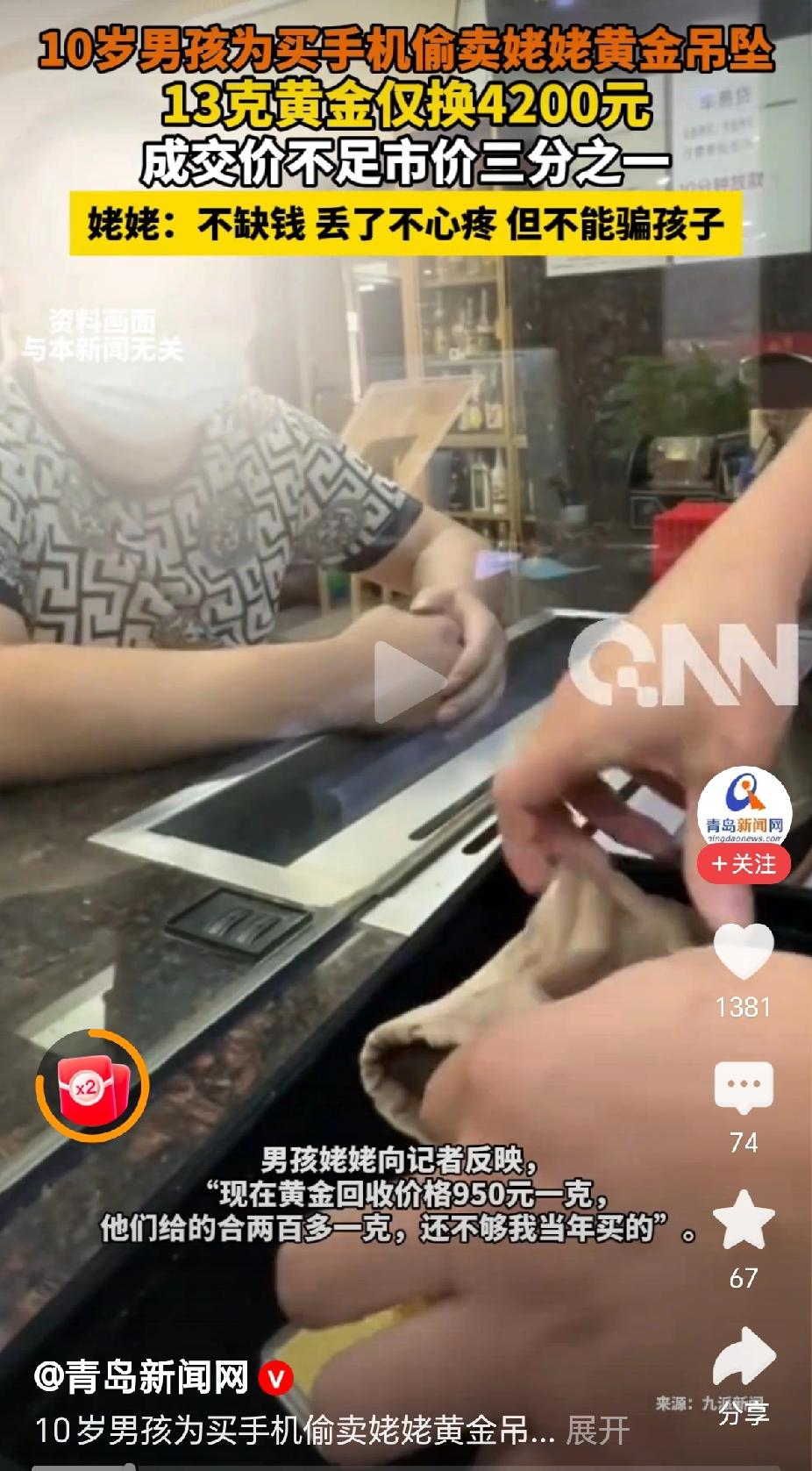 “无良了,10岁小孩为买手机将姥姥的13克黄金坠子仅4200元卖了!”近日,河南
