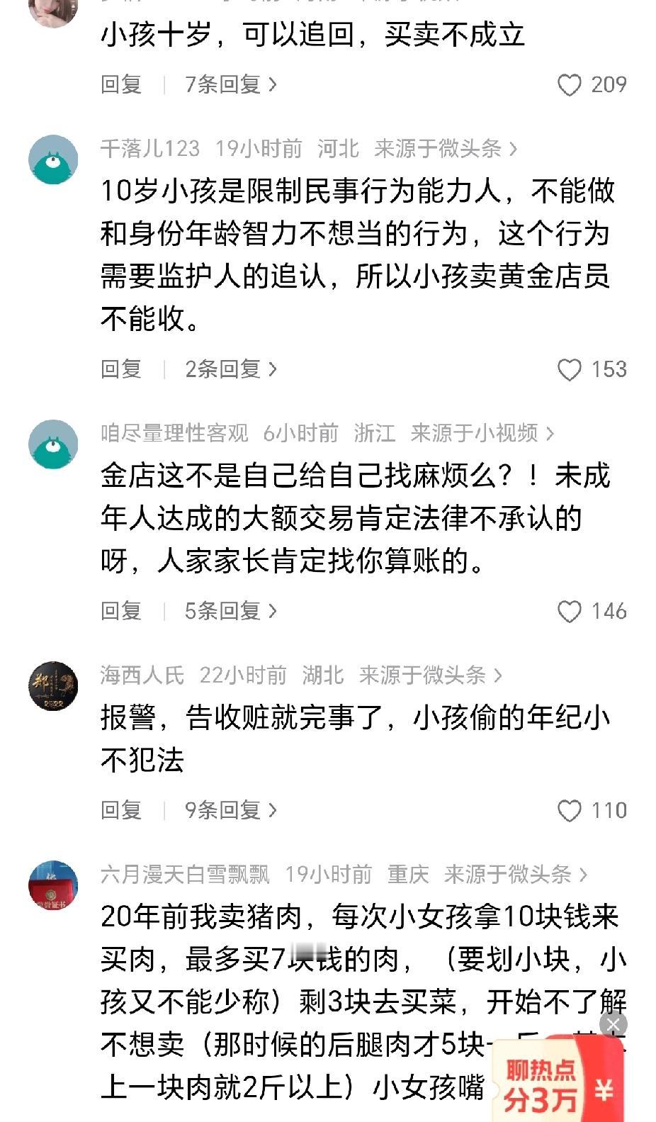 “无良了,10岁小孩为买手机将姥姥的13克黄金坠子仅4200元卖了!”近日,河南郑州,一家与回收黄金有合作的便利店,用4200元兑换了男孩的13克黄金吊坠。这件事情引起了大家的热议,冲上了。(来源,青岛新闻网V) 据视频报道,郑州的一位男孩,偷偷的将姥姥的一个黄金吊坠去便利店卖掉了,换到的4200元钱,用来买手机。 “不缺钱,丢了不心疼,但店家不能骗小孩!”姥姥说,现在黄金市价950元每克,成交价这还不到市价1/3。 “孩子用2300元买了一部手机,剩下的零花掉了!”姥姥说,“他们给的合200多一克,这个价钱还不足我以前买的价,商家太无良了!” “小孩十岁,买卖不成立,可以追回。”有网友评论说,小孩是限制民事行为能力人,不能做与身份、年龄、智力不对称的事,这个交易是无效行为。 “现在小孩子也太难管教了!”有网友评论说,竟然将姥姥的黄金首饰拿去变卖卖手机,这个手机的吸引力太大了,孩子的行为也需要管教。 是呀,这件事从法律上看是无效的买卖,未成年人没有取得监护人的同意,是不能够实施完全民事责任的。 同时,小孩子对手机的渴望也需要正确的对待,家长应该加强对手机的管控,十岁的小孩还是太小了,很容易就会形成网瘾。 对此,你的看法是怎样的呢? 十岁男孩未买手机偷卖姥姥黄金吊坠 姥姥13克黄金吊坠被4200元卖掉了 @秋实99 关注人生冷暖,拥抱幸福生活!