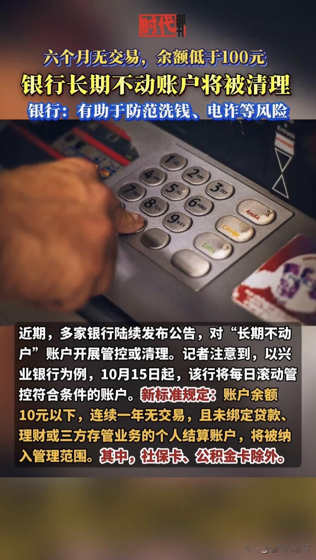 银行卡很多的小伙伴们注意啦 10月15日起,多家银行陆续将对“长期不动户”相互进行管控或者清理。像兴业银行,会每日滚动管控符合条件的账户,账户余额10元以下、连续一年无交易,且未绑定贷款、理财或三方存管业务的个人结算账户(社保卡、公积金卡除外)会被纳入管理。 不过不同银行对“长期不动户”认定标准不同,有的银行规定“6个月无交易、余额低于100元”就算。其实银行清理“沉睡账户”好处不少,能防范洗钱、电诈风险,保障资金安全,还能降低管理成本。