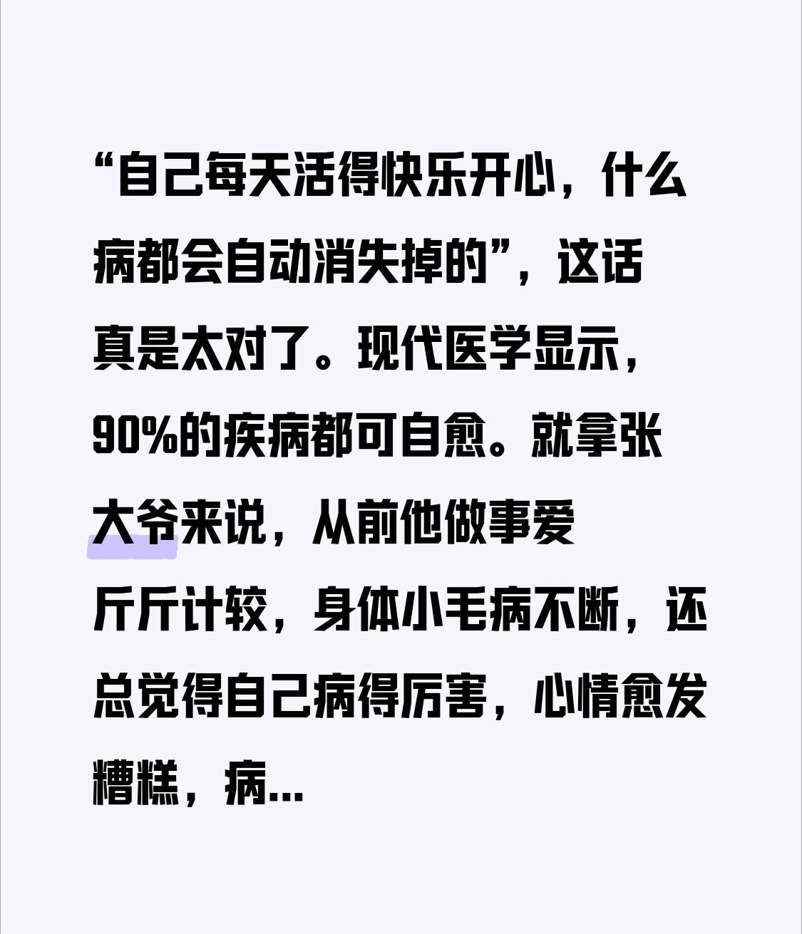 “自己每天活得快乐开心,什么病都会自动消失掉的”,这话真是太对了。现代医学显示,90%的疾病都可自愈。 就拿张大爷来说,从前他做事爱斤斤计较,身体小毛病不断,还总觉得自己病得厉害,心情愈发糟糕,病也就更难痊愈。后来在李大爷的带动下,他每天出去活动、放松心情,身体状况有了明显改善。 人越是快乐,经脉就越通畅,免疫力也越高。很多人以为养生就是吃好喝好,却忽视了心情才是健康的根源。别让情绪成为自己的敌人,开心地面对生活,许多问题都会迎刃而解。每天多问问自己:今天开心吗?