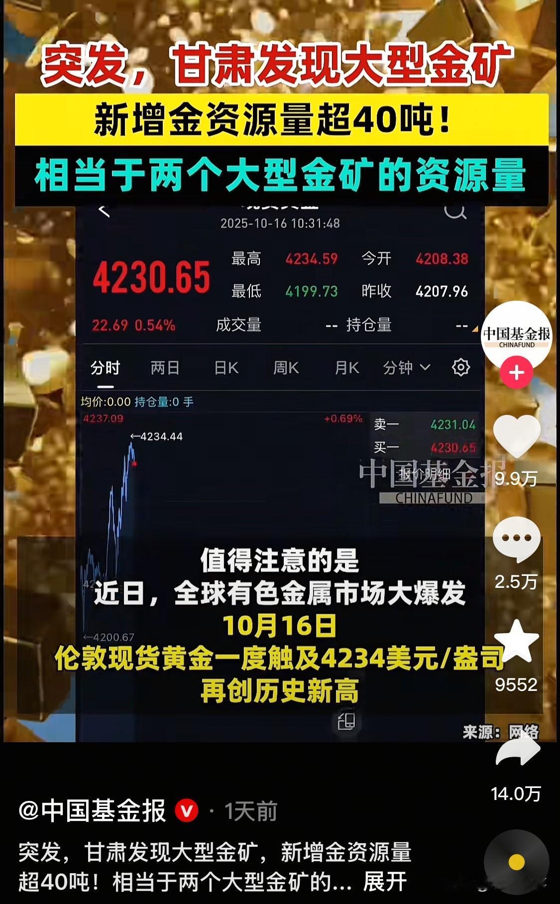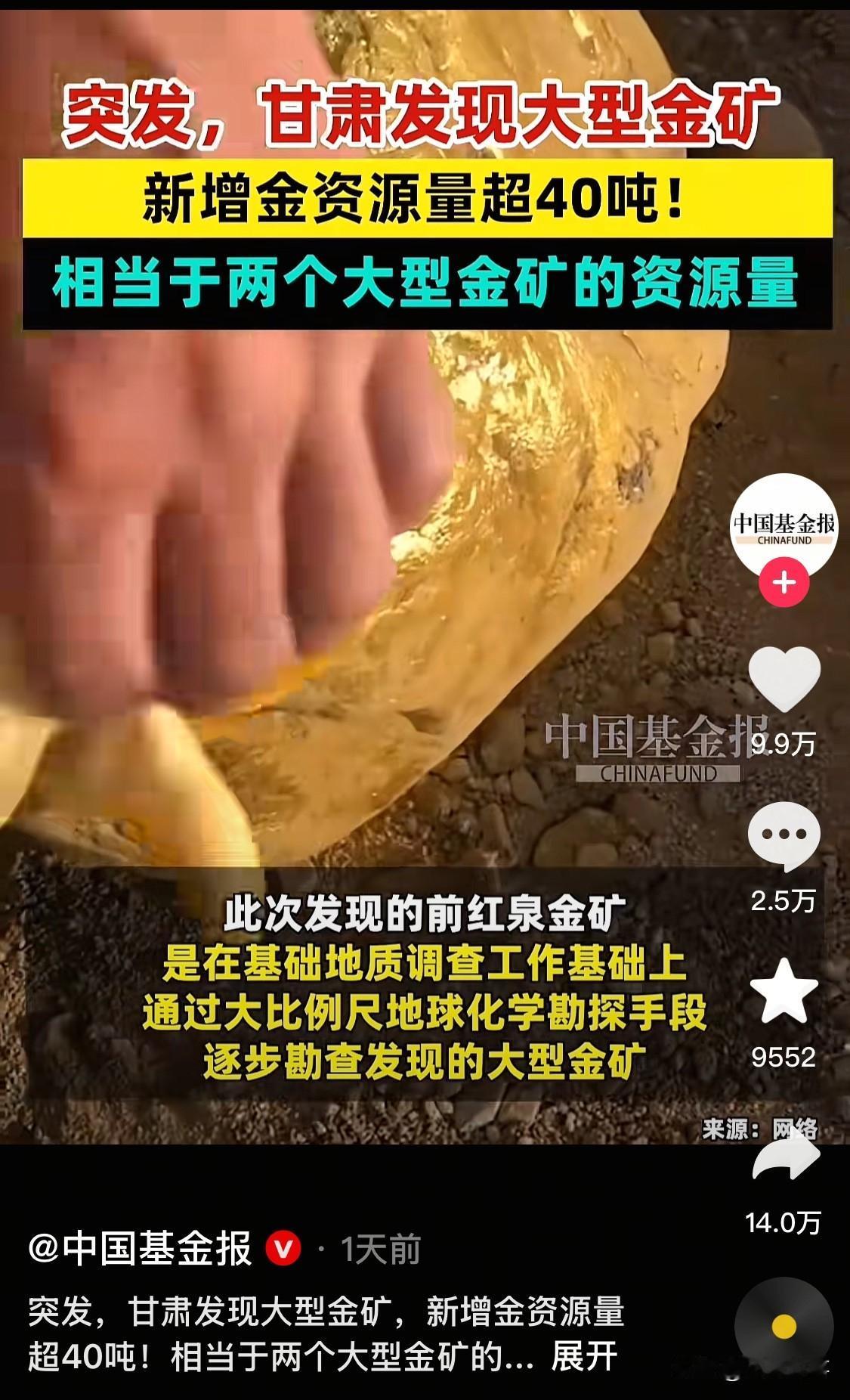 忽然宣布发现大型金矿,背后的考量值得深思!就在国际金价突破4300美元,节节飙升的时刻,我国忽然宣布在甘肃玉门发现大型金矿,关键储量十分惊人! 金价飙上4300美元关口,这数字烫得人心头发慌。全球央行都在疯狂囤金,去年净买入量冲到1081吨的历史峰值。黄金不再是闪亮的装饰品,早已变成国家金融安全的护城河。 玉门这座曾经因石油枯竭沉寂的城市,如今被金矿唤醒。地质队员在祁连山北麓奋战八百多昼夜,钻探岩芯深达千米,这份坚持背后是对资源安全的执着追求。 西方金融巨头边抛美债边扫货黄金,华尔街操盘手公开宣称“黄金才是终极货币”。当美元信用出现裂痕,我们握在手中的每一克黄金都是压舱石。 一些外媒阴阳怪气说发现时机太“巧合”,他们忘了中国地质调查局十年前就启动西部掘金计划。科技手段让深部找矿突破成为可能,遥感探测精度比十年前提升五倍。 黄金战略背后藏着能源革命的影子。光伏板需要金丝焊线,燃料电池要用金催化剂。新兴工业领域年耗金量正以12%增速扩张,这盘大棋下的是未来产业布局。 矿工们在四十度高温的井下取样时,不会想到自己捧着的岩石牵动着国际汇率。但国家智库清楚,资源自主权就是金融话语权,这份底气比黄金更珍贵。 各位读者你们怎么看?欢迎在评论区讨论。 玉门金矿 金矿开采