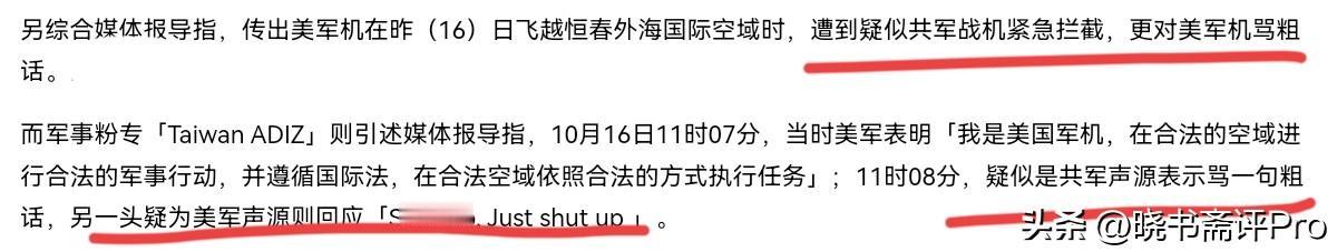 面对挑衅的美国军机,解放军飞行员“爆粗口”驱离,美飞行员情绪有点崩!10月17日,根据岛内媒体报道,岛内媒体称,今日上午8时37分起,国防部陆续侦获中共各型军机,包括中共歼-16、空警-500,共计21架次出海;其中17架次逾越中线及其延伸线,进入台湾北部、中部及西南空域。 而在解放军巡航台海之际,岛内媒体称,解放军战机在一日之前在台湾恒春外海国际空域发生了一起针对美国战机的驱离事件。岛内媒体表示,面对美军战机,解放军战机紧急拦截。美战机飞行员声称,其是在合法的空域进行合法的军事行动。而我方飞行员则直接以爆粗口的方式喊话回应,警告其必须飞离。 至于我方到底粗口讲了什么,不得而知,但是美军飞行员明显情绪有点崩,脱口而出,Shut up, Just shut up(闭嘴,给我闭嘴) !很显然,通过这样的喊话驱离来看,解放军飞行员的喊话肯定是戳到了美飞行员的痛点,不然美方飞行员的情绪不会如此之大。 这样的事件说明什么呢?这说明我方飞行员士气旺盛,对自身的训练,技战术,以及战机的性能非常的有信心。正因为有了建立在此基础上的心理优势,我们才对挑衅的美战机丝毫不惧,底气十足。很显然,美战机到我们的家门口挑事,这完全是自讨没趣,碰一鼻子灰。而岛内“台独”势力指望占不到丝毫便宜的美军撑腰以“谋独”,那更是痴心妄想!