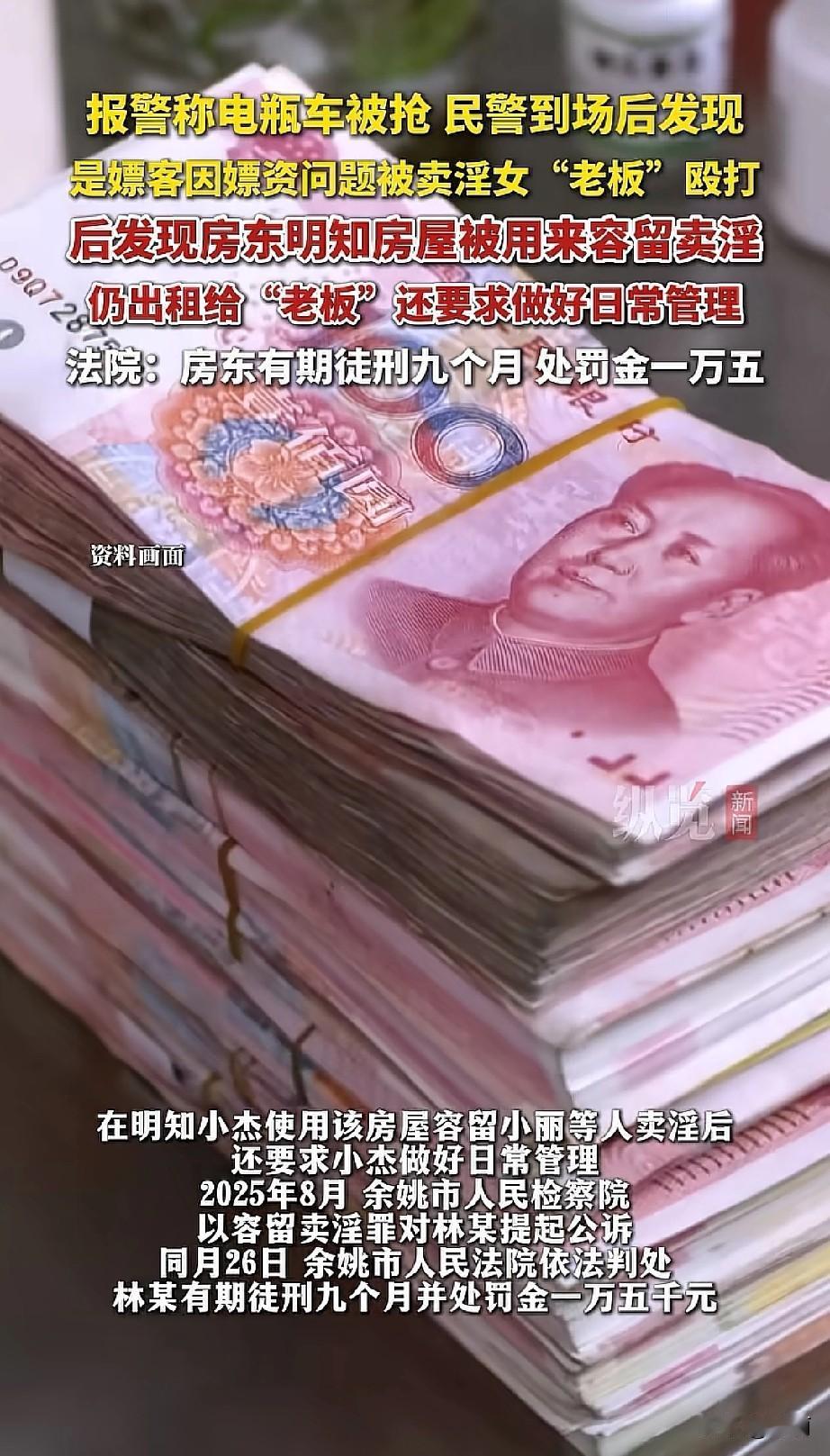 浙江余姚有这么档子事。有人报警说电瓶车被抢,民警到了现场一查,根本不是抢劫。报警的小冬是嫖客,因为嫖资和卖淫女起了冲突,被对方的“老板”小杰等人打了。他走的时候没找到电瓶车,就以为是被对方抢了。 民警依法处理了小冬和卖淫女,顺着线索又挖出了房东林某。林某2023年租房给小杰时就怀疑对方容留卖淫,没管。小杰刑满释放后,他又把空房租出去,明知对方干违法的事,还让小杰做好“管理”。 最后林某因容留卖淫罪被判了九个月,罚一万五。这事儿挺明白,违法的事干不得,房东租房也不能“睁一只眼闭一只眼”,明知租客搞违法活动还提供场地,照样要担责任。110也不是随便能打的,报假警浪费警力,事儿也藏不住。