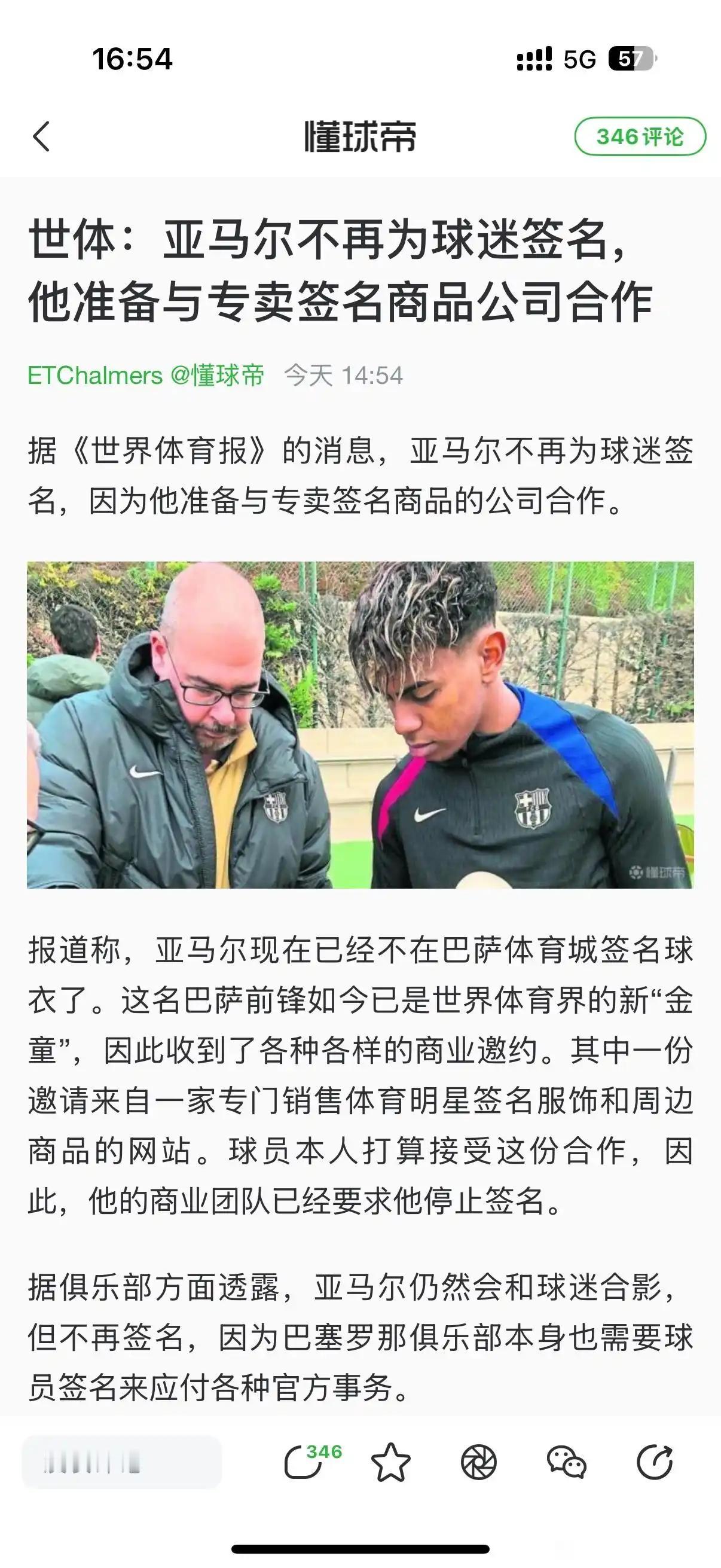 亚马尔的骚操作来了,不再为球迷签名,只跟专卖签名公司合作?? 我估计亚马尔很快造出来辟谣,这种事很败人品,皇马球迷看到都笑疯了。 哪有球星这么自大的,给球迷签名是球员应该的事情,怎么签名要签? 我认为亚马尔和网红走得近,不是好事。[震惊]