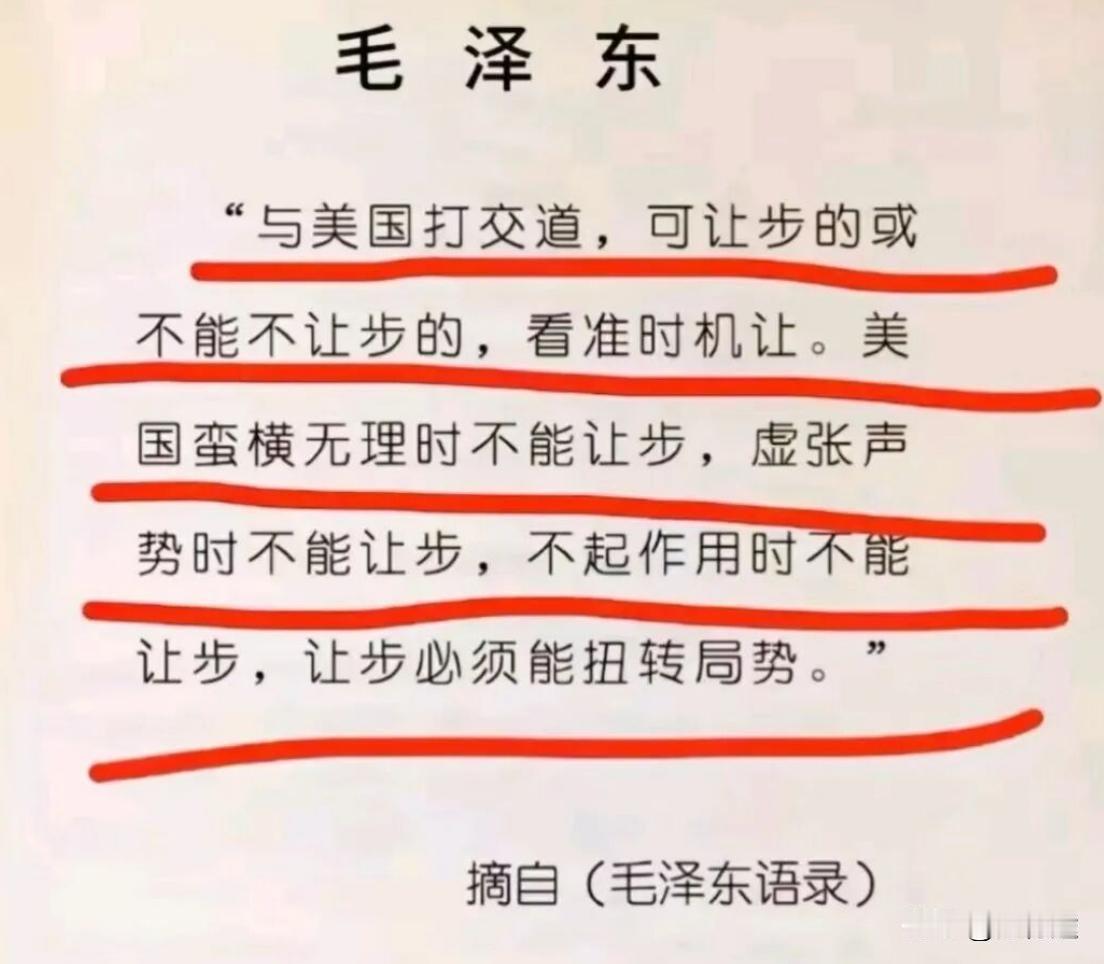 伟大领袖毛主席早就预料到了美国的“狼子野心”了,耍点小聪明,想阻挠中国发展,也是不知道天高地厚,咱泱泱大国,又何怕尔等“跳梁小丑”们上窜下跳?主席是多么的高瞻远瞩,曾说:“与美国人打交道,可让步的或不能让步的,看准时机让。美国蛮横无理时不能让步,虚张声势时不能让步,不起作用时不能让步,让步必须能扭转局势。” 那时候,中国刚立起来,底子薄得很,家里连成套的工业体系都没有,东北那点军工厂还得小心防着美国侦察机。 可毛主席说了:“原子弹是纸老虎。”不是喊口号,也不是激将法,是算过账的。 毛主席心里清楚,美国人有算盘,他们不是真想打死你,他们是想吓你。你怕,他们就赢了。 抗美援朝那年,冬天特别冷,冷得铁都能裂。 没人想打,可这仗不打不行。美军已经推到鸭绿江边了,再不动手,东北也就不安全了。 打仗靠的不光是枪,得有胆子。毛主席拿主意的时候,也不是拍脑袋,坐在会客室里,翻来覆去就一句话:“人要有骨头。”打出去,不是为了朝鲜,是为了把中国的尊严立住。 第一仗赢了以后,部队往回撤,美军搞不明白——怎么会打赢了还后退?麦克阿瑟说这是中国军队弹尽粮绝了,得追,赶紧追。谁也没告诉他,那其实是毛主席设的局。他就是等你追。他早就把地形、补给、兵力都算好了,布了一张大网。 结果三万多美军掉进来,其中还有个美军集团军的司令,车一翻,人没了。 美国媒体第二天整版黑框,说那是美军最耻辱的一天。 白宫那边,杜鲁门急了,站在记者会上说要动用一切武器。有人问他是不是包括原子弹,他摘了眼镜,说:“你懂不懂什么叫一切?”这话一传到北京,气氛马上紧了。 毛主席那天正在开会,秘书送进来一张纸,说是绝密,原子弹要动了。 他没慌,听完,反而让秘书大声念出来。念完,毛主席站起来,说:“他打他的原子弹,我打我的手榴弹。”说完坐下,没再讲一句。 他知道美国人不敢真扔,哪怕带着原子弹在周边海域转来转去,也不是真准备扔。他们怕失控,怕中国不怕,怕苏联趁机出手。毛主席敢讲这话,是把人心看透了。 抗美援朝打完,中国没拿到一寸地,却让全世界重新看待中国。 你可以不喜欢中国,但你得尊重它。 毛主席也没拿这事大肆宣传,就一句话:“打出了志气。”没开庆功会,也没颁多少奖章。 过了一阵,他说:“打仗不能老讲感情,该讲算账。” 五十年代,中国被两个大国盯着,一个是苏联,一个是美国。 两边都想把中国拉过去当棋子。苏联人嘴上说是老大哥,骨子里也想控制中国。毛主席看得明白。他说:“不能靠别人替我们独立。”不是不想和人合作,是明白谁出的钱,谁说了算。 靠苏联,技术是他们的,定价是他们的,连路线都得听他们的。靠美国?更不可能,美国连联合国的席位都不想给中国留。 所以那个时候,中国外交不急着动。 他在等。他说:“我们不赶时间,我们有时间。”这话后来被很多人当成耐心,其实不是。他等的,是对方露出破绽。他知道美国在越南打不下去,迟早得找人谈;他知道苏联在欧洲也焦头烂额,没空两边挑事。 等到七十年代,风向真的变了。 美国先派了个副官黑格来,说尼克松想来中国。 毛主席听完没有马上答复,只说了一句:“他们着急,就让他们多走几步。”外交部拟答复,他亲自改了:“不靠外力保独立。” 1972年,尼克松来了。 他下飞机那一刻,没人敲锣打鼓,也没有红地毯铺满机场。毛主席没去接,只让人转一句话:“他要来,是他自己的意思。” 美国人原本准备的“总统首次访问未建交国家”的剧本,被这一句话顶回去了。 尼克松见面之前试了几招,说要坐自己的防弹车,毛主席说:“怕死别来。”说要用空军一号,主席说:“到中国的天上,就得听中国的安排。”又说要电视直播,说中国设备不行。 主席说:“买。”真派人去美国买设备,对方一看,中国是真买,还涨价。国内汇报说钱不够了,毛主席回一句:“给,咱不讲价。”这不是阔气,是讲面子。 一个国家如果事事讨价还价,谁还看得起你?设备最后装好了,美国人用完还得交租金。 尼克松准备了很多外交辞令,想着好好铺一铺话术。 可真正见面那天,是临时通知的。他正在房间准备午睡,基辛格进来说:“现在去见毛主席。”没给提前通知。因为毛主席一贯就是这样——你来,我见,不见也不是不礼貌,是我这边的节奏。尼克松只能换衣服,急匆匆赶过去。 中南海的书房不大,也不讲排场。 墙上全是书,从地板堆到顶。毛主席坐在一张旧沙发上,身体已经有些虚,脸色苍白。 他开口第一句就说:“我不谈政治,我跟你谈哲学。”这一句话,让尼克松乱了节奏。他来是谈台湾、越南、冷战的,结果毛主席说要谈哲学。 尼克松回去写回忆录,说自己“像一个犯错的学生,站在老师面前”。他不是怕,而是没底气。他感觉这个老人不需要讨好谁。 毛主席晚年的时候,不太多讲话,尤其是对美国。他说得最清楚的一次,是一句简短的话:“对美国,要分清哪能让,哪不能让。虚张声势时不能让,不起作用时不能让,让步必须能扭转局势。”