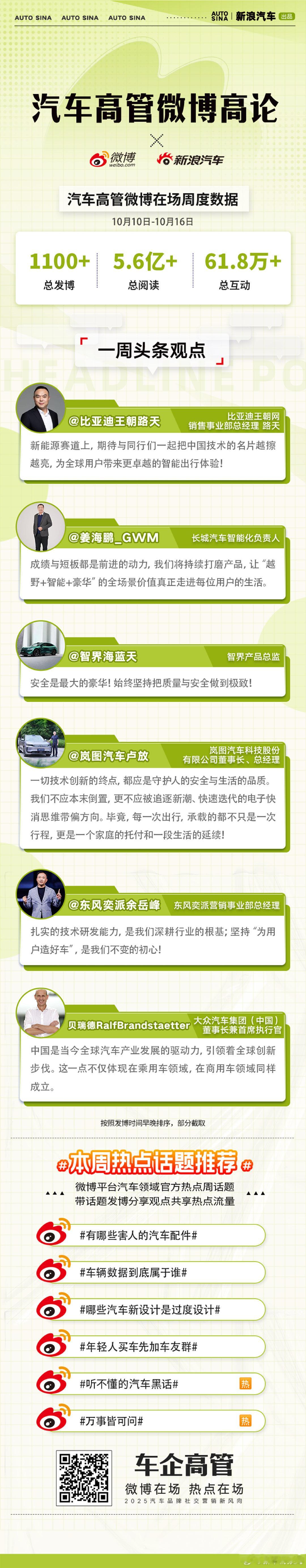 以跨场景的融合创新,重新定义未来出行,引领汽车产业迈向以安全与用户体验为核心的新纪元。汽车高管微博高论,省流速览微博一周高管精彩观点!