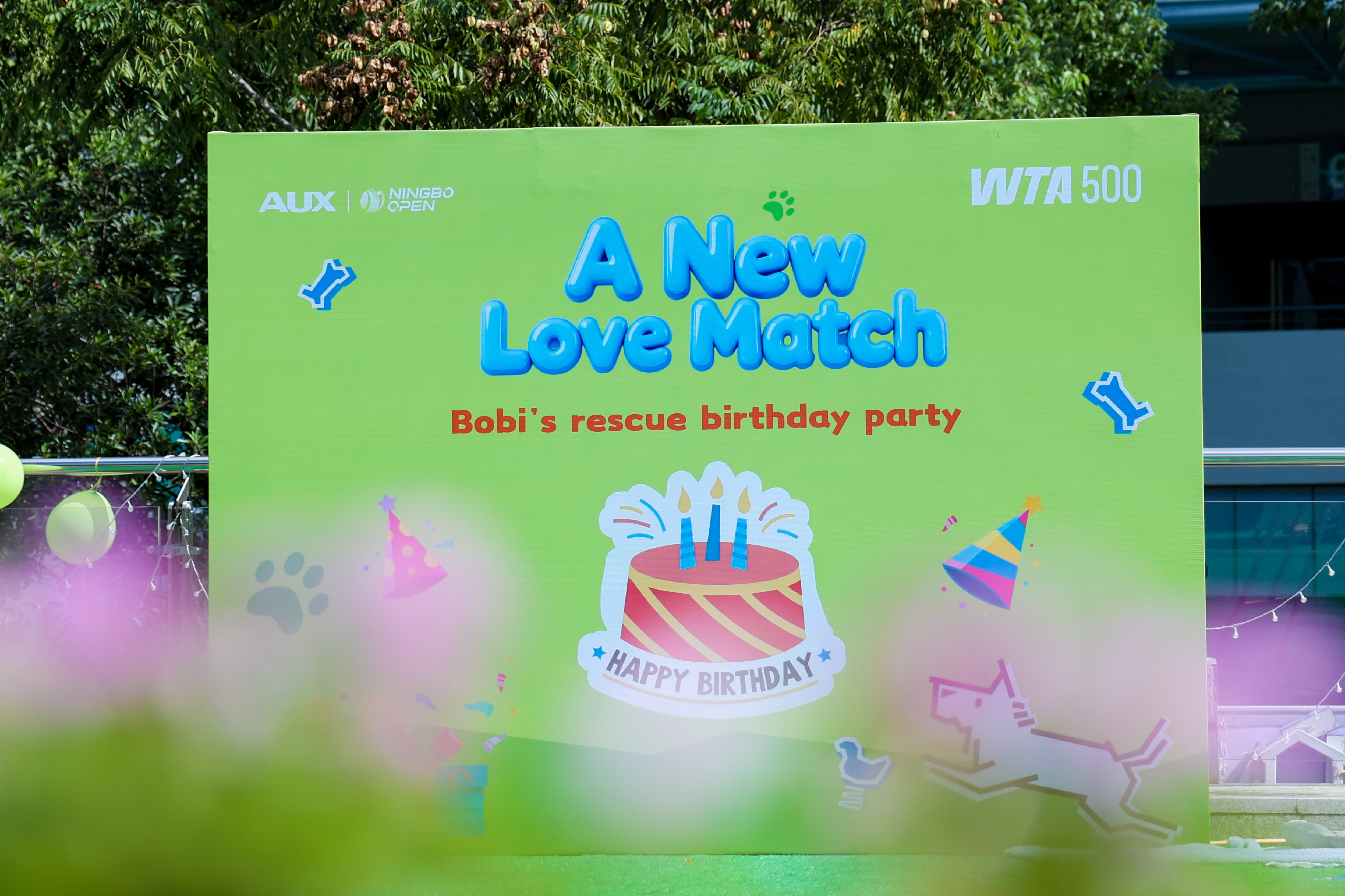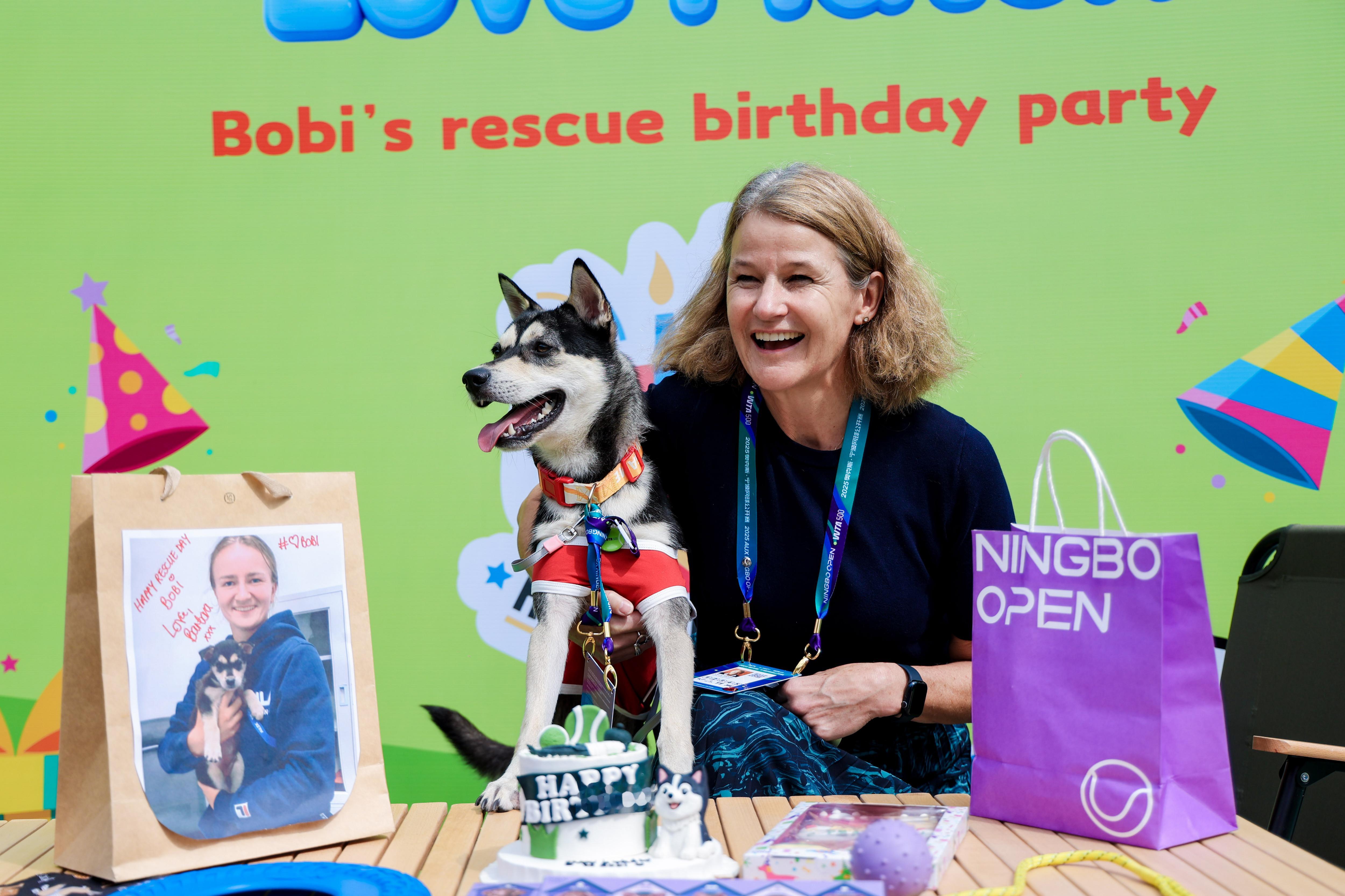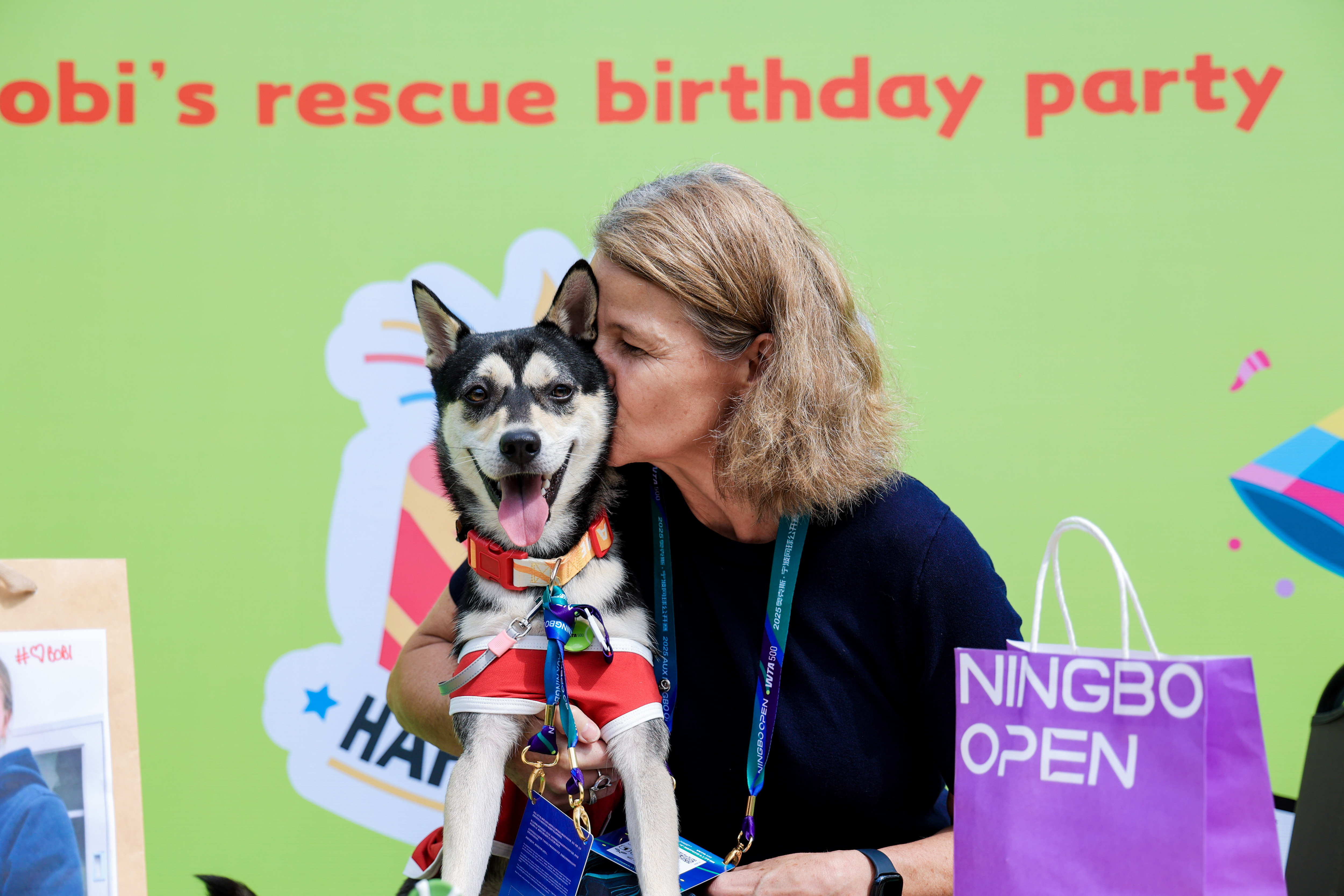 今天是小狗波比的生日,它就是去年的今天获得救助的。上午赛事为它举办了生日会,小波比生日快乐!