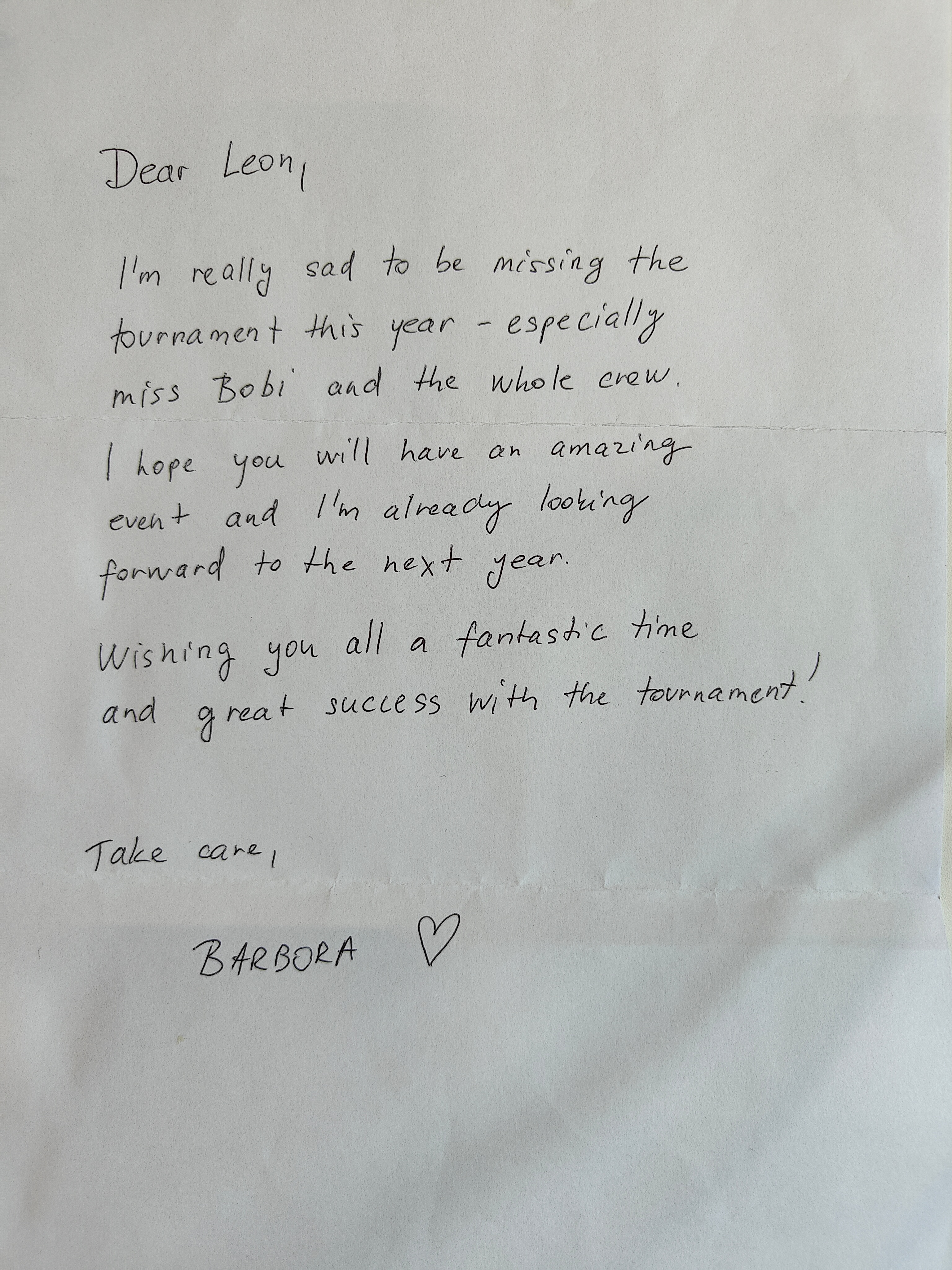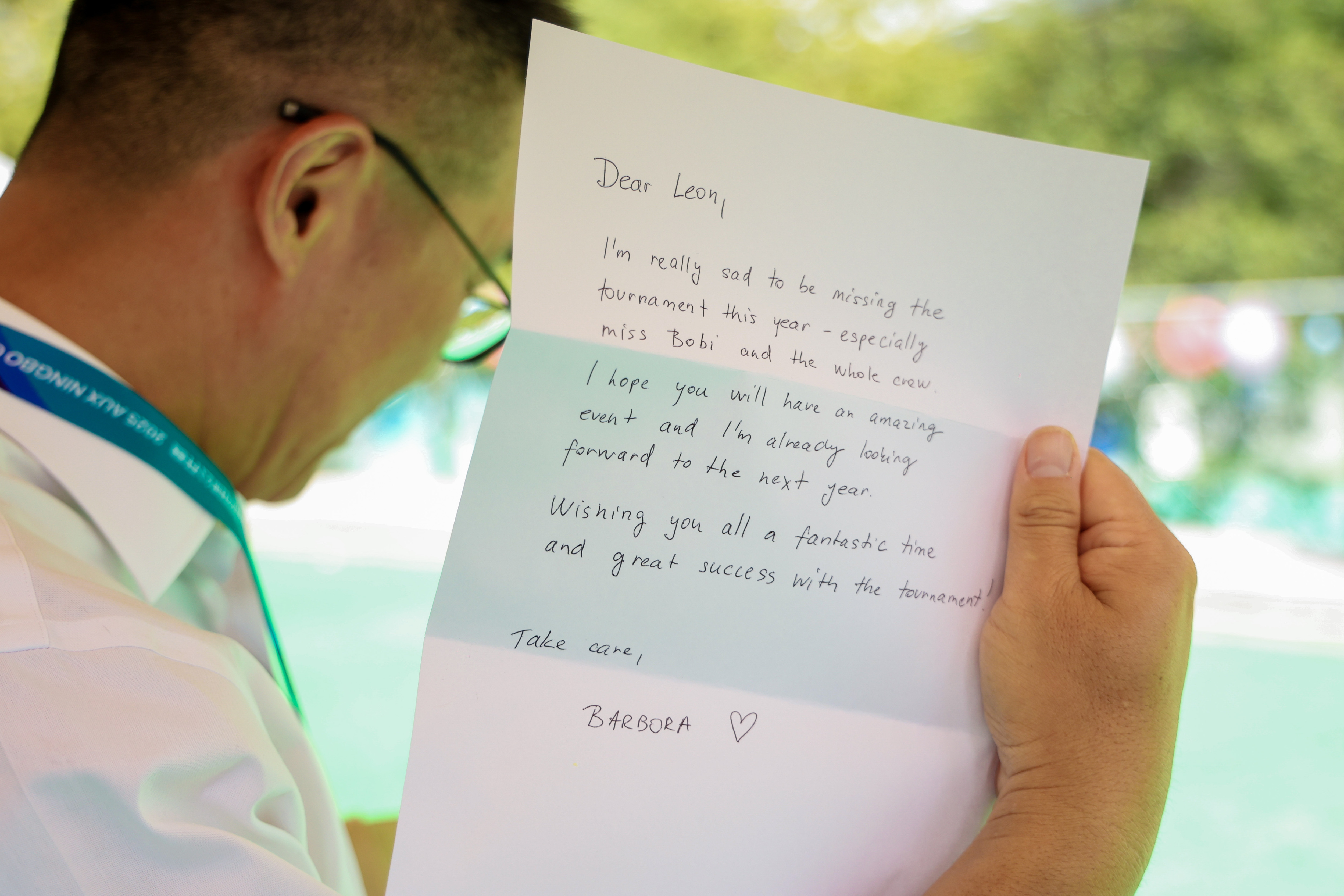 她还给赛事联合赛事总监、同时也是波比在宁波的日常收养人沈鸿先生手写了一封感谢信,说已经忍不住开始期待明年来宁波了。刚才我托沈鸿先生征询克雷吉茨科娃的意见,她同意将这封信公开。