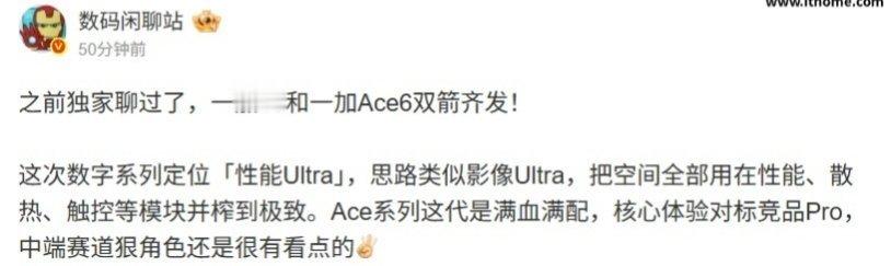 此外,该博主还表示一加 15 和一加 Ace 6 两款新机将“双箭齐发”。其中数字系列定位「性能 Ultra」,思路类似影像 Ultra,把空间全部用在性能、散热、触控等模块并榨到极致;Ace 系列这代是满血满配,核心体验对标竞品 Pro。