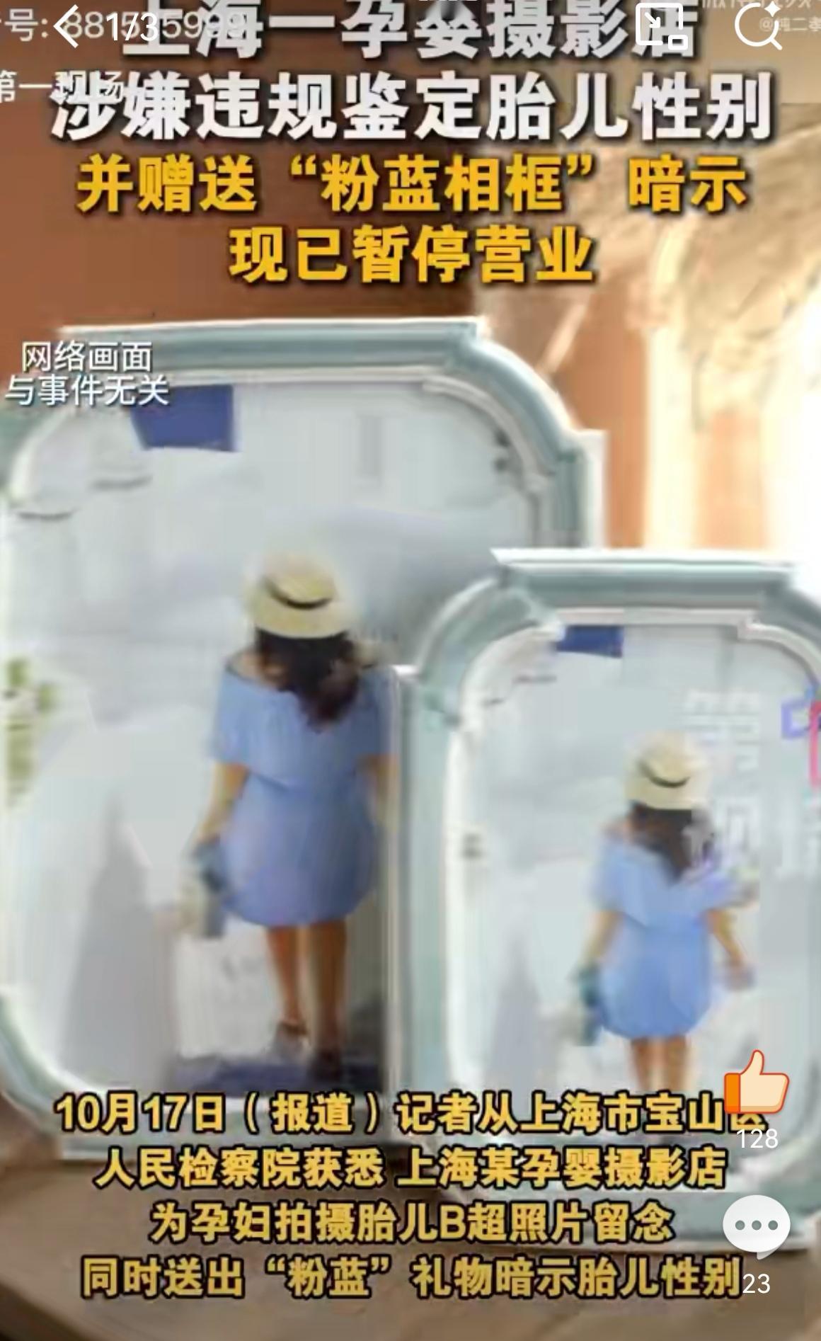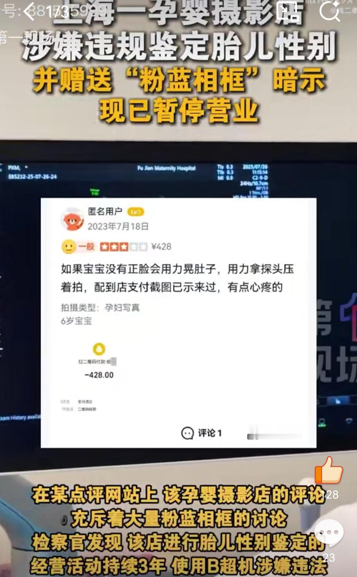 太气人了!上海竟有孕婴摄影店,用粉蓝相框玩起了暗示胎儿性别的“把戏”,还非法使用B超机,这是公然挑战法律红线啊! 你能想象吗?当准爸妈们满心欢喜地去拍胎儿照片,以为是温馨的纪念,却没想到掉进了摄影店设的“性别暗示”陷阱。这家店的评论区全是各种暗示性的话语,什么“粉相框代表女孩”“蓝相框就是男孩”,简直把非医学需要的胎儿性别鉴定当成了公开的秘密。更过分的是,还有工作人员用力晃孕妇肚子的粗暴行为,这得多让准妈妈们揪心啊! 从法律层面看,《关于严禁非法使用超声诊断仪开展“胎儿摄影”活动的通知》明确规定,禁止任何单位和个人实施“两非”行为,而这家店却顶风作案,持续3年进行非医学需要的胎儿性别鉴定。同时,超声诊断仪作为第二类、第三类医疗器械,只能用于医疗机构临床诊断,可这家摄影店却非法使用,设备来源、质量不明,工作人员也没资质,这对孕妇和胎儿的健康风险简直无法估量。 这起事件,不仅是一家店的违法问题,更反映出社会上一些人对法律法规的漠视,对生育观念的错误认知。如果这种行为不被制止,会严重破坏社会的性别平衡,影响人口结构的稳定。 我们必须要明白,生育是一件神圣的事情,不是用来满足某些人好奇心或偏见的工具。希望这样的处罚能给其他商家敲响警钟,也希望准爸妈们能提高法律意识,别再被这种违法的“服务”所迷惑。让我们共同守护健康、和谐的生育环境,别让类似的闹剧再次上演。