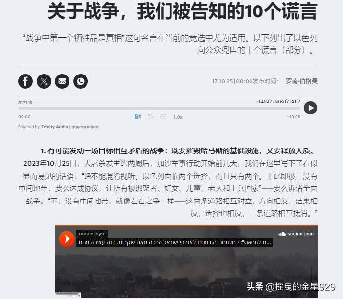 以色列2年战争的十大谎言——著名以色列军事记者罗南·伯格曼发表文章,总结加沙战争期间以色列政府向公众兜售的十大谎言。 1、战争初期:可以且应该同时实现消灭巴勒斯坦抵抗运动和救回所有以色列囚犯,不存在第三种中间路线。事实上,这两个目标是相互矛盾的,战争最终以中间路线结束,且以色列军方内部多次承认事实上并不重视第二个目标。 2、贯穿战争全程:只有通过军事行动可以将以色列囚犯救回。事实上,以色列军队的军事行动造成了大量以色列囚犯死亡,被武力救回的囚犯屈指可数,事实上几乎所有幸存的囚犯都是通过换囚协议获释的。 3、贯穿战争全程:全面协议即将达成,但哈马斯拒绝达成协议。事实上,几乎每一次协议的破裂都是因为以色列的拒绝或变卦。 4、贯穿战争全程:内塔尼亚胡没有破坏协议,始终把“人质”放在第一位。事实上,内塔尼亚胡多次故意破坏协议,且总是以“全面胜利”等模糊而不切实际的口号强行压过救回以色列囚犯等相对现实的目标。在2025年3月,内塔尼亚胡通过第二次发动加沙战争,将以色列陷入了政治外交海啸,遭受了前所未有的国际压力。 5、2024年6月-7月:拉法边境走廊哈马斯的主要走私路线,“人质”也会通过这条路线消失。事实上,自2017年以来,埃及总统塞西主导了从拉法方向对加沙地区的严格封锁,过去存在的拉法走私地道自此之后已经无法使用,战争期间巴勒斯坦抵抗运动也从未尝试过将以色列囚犯通过拉法转移出去。 6、贯穿战争全程:只要杀死某某某,哈马斯就会自动投降。然而,随着叶海亚·辛瓦尔、萨拉赫·阿鲁里、伊斯梅尔·哈尼亚、穆罕默德·戴夫、穆罕默德·辛瓦尔等多名“哈马斯”领导人先后殉难,“哈马斯”并没有自动投降;相反,每次发生暗杀后,双方的谈判都会陷入僵局,而后以色列将不得不作出更大的让步以重启谈判。 7、贯穿战争全程:只要占领某某地点,哈马斯就会自动投降。这个就不需要解释了,首先你得实现所计划的占领某某地点,然后才能讨论这个假设是否成立。 8、某些时间点:哈马斯永远不会释放“人质”。事实上,在战争的第一天,巴勒斯坦各个抵抗运动就提出了交换全部囚犯的计划。 9、贯穿战争全程:支持停火换囚的抗议对“哈马斯”有利。事实上,在战争的整个过程期间,巴勒斯坦抵抗运动都没有怎么搭理过以色列国内的抗议,也没有与抗议者建立联系。 10、战争末期:对待协议的极端态度,不是“哈马斯投降了”就是“以色列投降”了。罗南·伯格曼认为,协议是互相妥协的结果,不存在某一方投降,也不应该以这种二极管思维去看待此事。