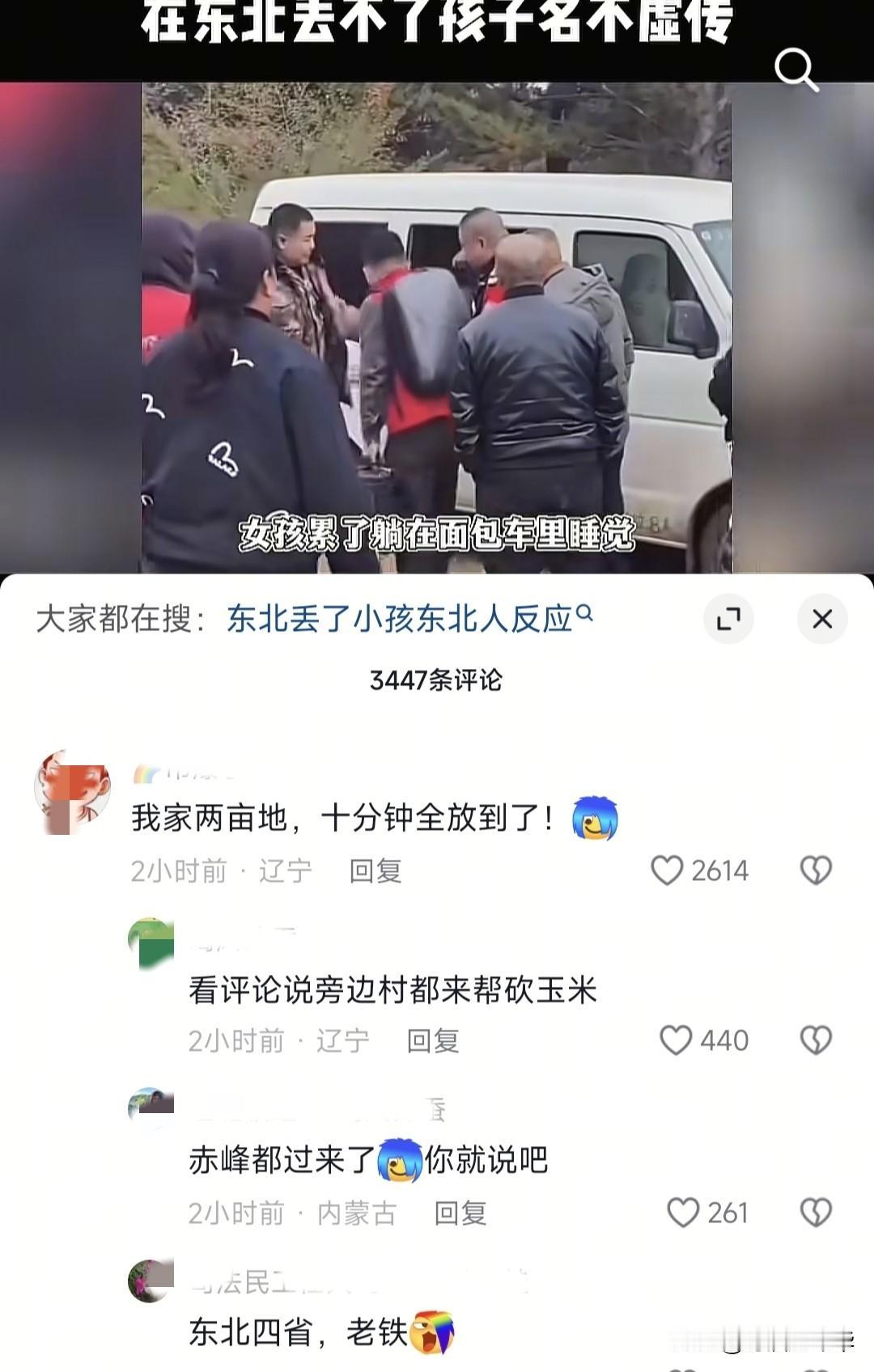 东三省加蒙东一起努力!2天,48小时,37个村子,好几千户,12000人的结果!通过这次辽宁小女孩失踪事件就能知道,东北为啥是最不容易丢孩子的地区了,上万人次同时地毯式排查,周围几公里的苞米地一夜之间全部被放倒,而且是用镰刀割的,怕机器伤到孩子,有网友评论自己两亩地苞米十分钟就被砍倒了,东三省和蒙东的专业救援队,当地自发参与搜救的几千名群众,找到孩子那一刻泪崩的所长,这一切都是东北孩子的坚强后盾。