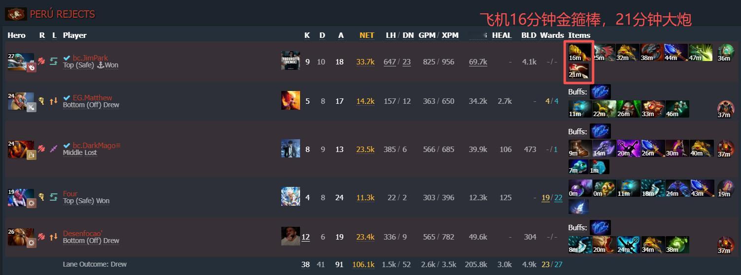 Matthew:我们和Jimpark的矛盾在第一场次级联赛就初现端倪了,当时他的飞机出了一套非常恶心的装备让我们输掉了比赛(图2),队员都劝他说不要这么出装但他坚持说只要控盾就能赢,说实话那场比赛打完我心态就有点炸了,我感觉这家伙对比赛的态度太随意、不认真了,有时候他刚进Discord聊天频道直接就睡着了,因为开着摄像头,我们所有人都能看到他在睡觉,这我倒还能理解,毕竟在秘鲁打这个欧洲线上赛会有一些时差,所以我不怪他,但是他对比赛的态度实在过于摆烂了,在那场比赛后我们内部开了个会,我说【我这话不是针对Jimpark的,是对所有人说的:如果你们有人想摆烂,那不如索性就别打这个比赛了,现在这样纯粹在浪费我时间】,然后Jimpark就炸毛了,他觉得我这话再针对他,然后他就对着我喷了半小时,我懒得理他,后来我听说他跟DarkMago也吵了一架,我们实在没法跟这种人一起打刀塔,所以我们就喊来了payk