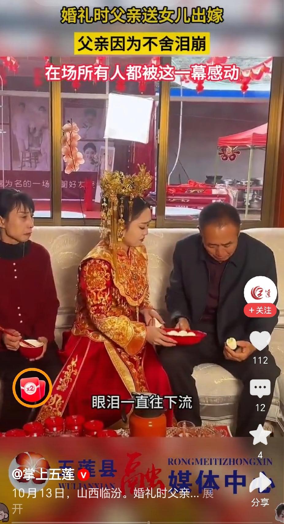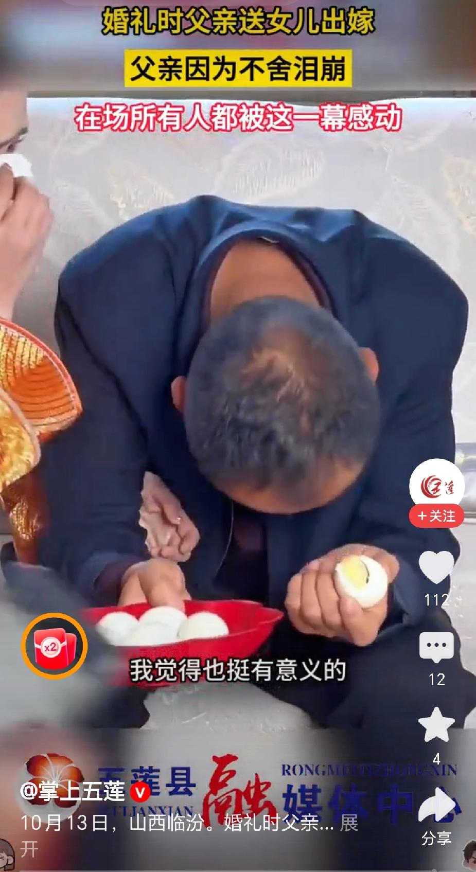 “泪崩了,女儿出嫁父亲不舍泪流满面!”近日,山西临汾,婚礼时父亲送女儿出嫁,父亲因为不舍得泪崩,在场所有人都会这一幕所感动!(来源:@掌上五莲V) 据视频报道,10月13日,临汾一家正在办喜事,女儿穿戴整齐正要出嫁了,父亲端着一盘鸡蛋喂着女儿吃。 父亲边喂女儿鸡蛋,自己边流着眼泪。接着痛哭出声,女儿帮父亲擦拭眼泪,一旁的妈妈也双眼红红的。 这一幕被婚礼的摄影师拍下来,摄影师说,“当时这个画面特别让我感动,我也觉得挺有意义的,于是记录了下来!” “儿女最终都会创造自己的家庭!”有网友说,这离别的一幕终究会经历,这就是我们传统的习俗,一代一代生生不息! “儿女出嫁的时候喂鸡蛋是为什么?”有网友说,父母的养育之恩,都在这一盘鸡蛋当中。 儿女长大了成家立业,做父母的肯定依依不舍,但我们却都是在这轮回的过程当中,一代一代的在传承! 对此,你的看法是怎样的? 女儿出嫁时为什么父亲哭的多 @秋实99 关注人生冷暖,拥抱幸福生活!