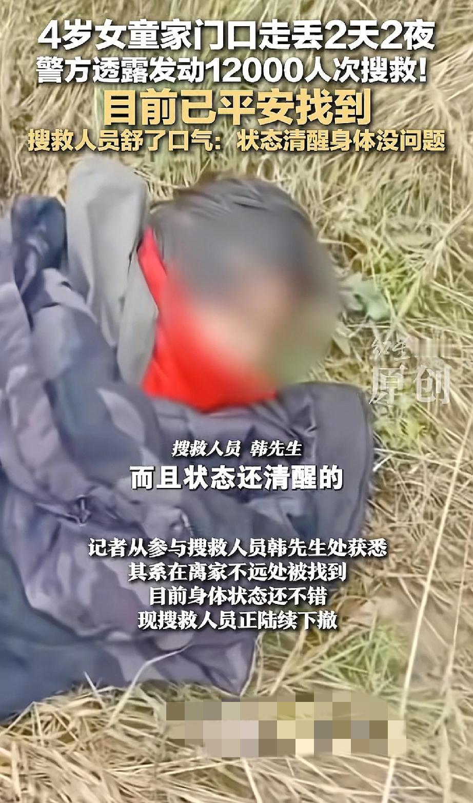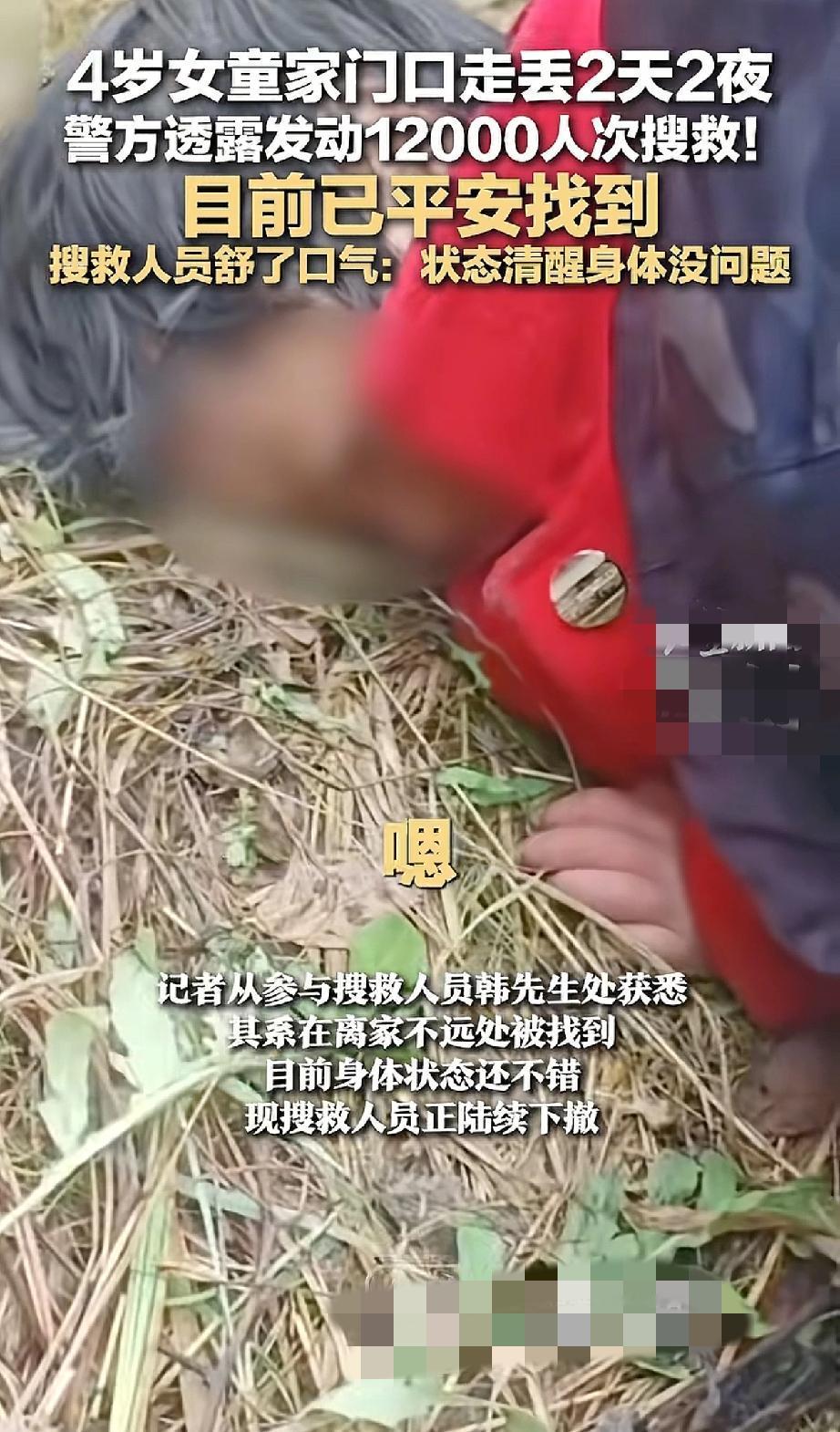 这真是个好消息!4岁女童在家门口走丢2天2夜,经过救援人员的不懈努力,终于找到了小女孩。 根据红星新闻报道,警方透露共发动12000人次搜救。女孩在离家不远处被找到,目前身体状况还不错,只是有一点皮外擦伤,有点冻伤。已经安排到医院去检查救治。 真的要好好感谢那些参与救援的人员。他们都是爱心之人,感谢那些默默无闻的人,无私奉献的精神。将孩子找到那一刻,相信孩子的奶奶可以长舒一口气了。 孩子的丢失牵动着大伙的心,感谢所有参与救援的人员,你们辛苦了!