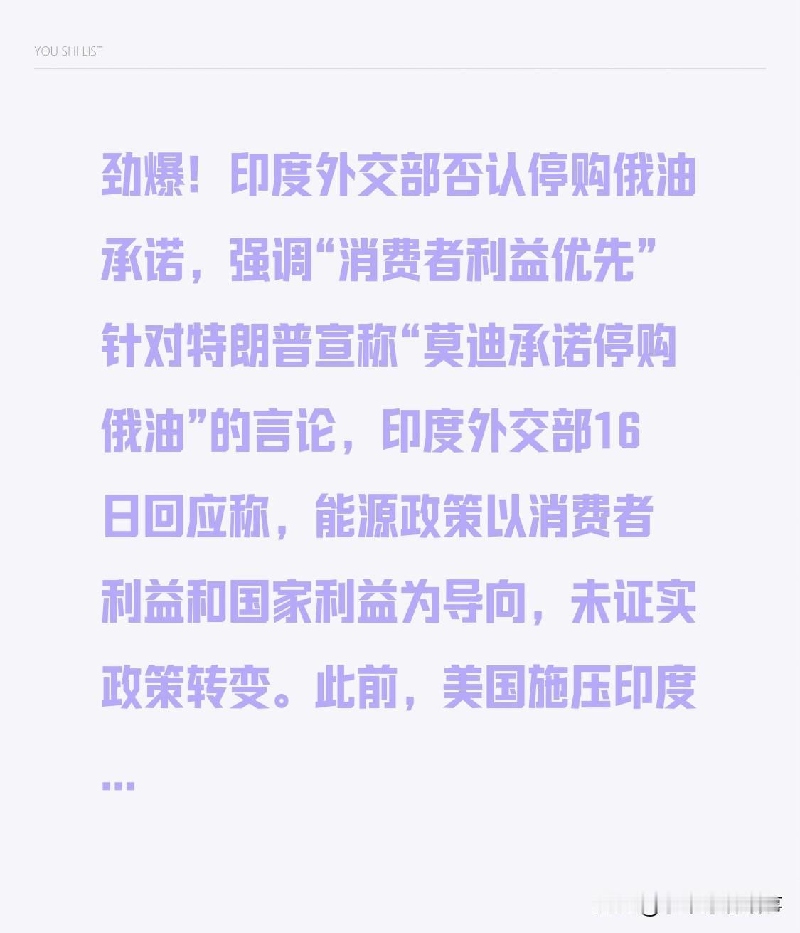 劲爆!印度外交部否认停购俄油承诺,强调“消费者利益优先” 针对特朗普宣称“莫迪承诺停购俄油”的言论,印度外交部16日回应称,能源政策以消费者利益和国家利益为导向,未证实政策转变。此前,美国施压印度停购俄油,甚至威胁加税至100%,印度则提出条件:“要么放行伊朗、委内瑞拉油,要么继续买俄油。”数据显示,俄油占印度进口三成,价格比美油低7美元。分析认为,印度此举旨在平衡美俄关系,同时保障国内能源供应。印度俄油进口 印度买俄油 印度选择俄罗斯