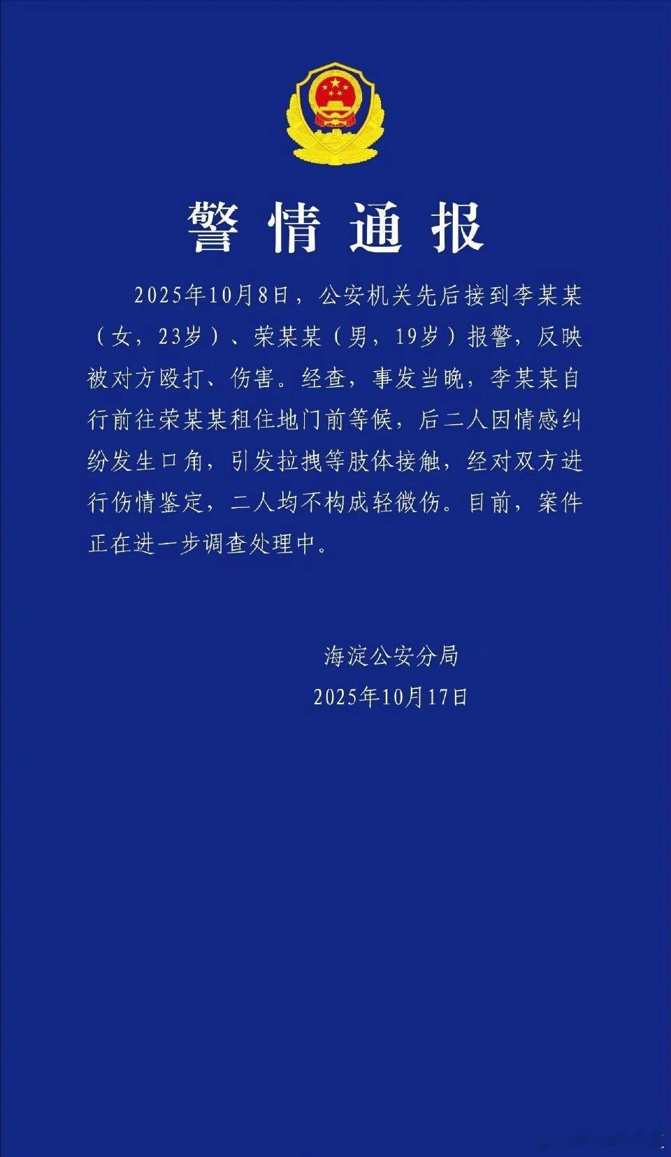 通报来了!称荣梓杉与李禹熹存在拉拽等肢体接触,但均不构成轻微伤。