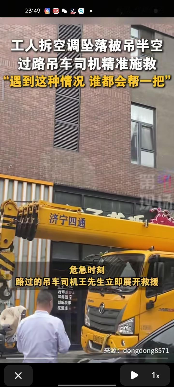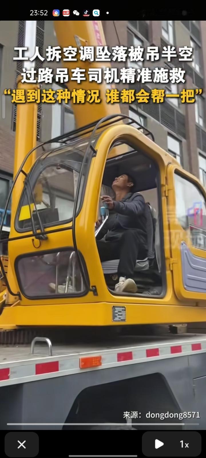10月17日,北京,工人拆装空调时不慎跌落,被绳索套住脖子和手,悬在空中无法脱身。危急时刻,路过的吊车司机立即展开救援。吊车司机称,遇到这种情况,谁都会帮一把