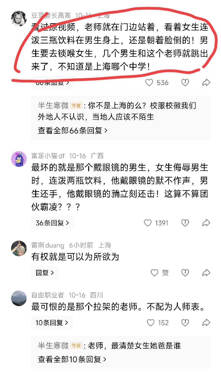 上海女生连泼男生两杯饮料, 这个女生的嚣张跋扈真的看不下去, 但是更让人感到痛心的是周围同学还有老师的反应! 根据网友的评论,说看过原视频。老师居然在门外看着女生将三瓶饮料顺着男生的脸上倒下去,却默不作声,周边的同学也是一动不动,果然是什么样的老师教出什么样的学生。 直到这个男生发起反抗之后,锁住了女孩的脖子,没想到这个老师和几个男生马上上去拉住男生。 由此可见,这个女生就是这个学校的野蛮公主一样,而且背后说不好还有小团体。就这样的学校,劝男生还是早点转学为安,大家觉得呢?