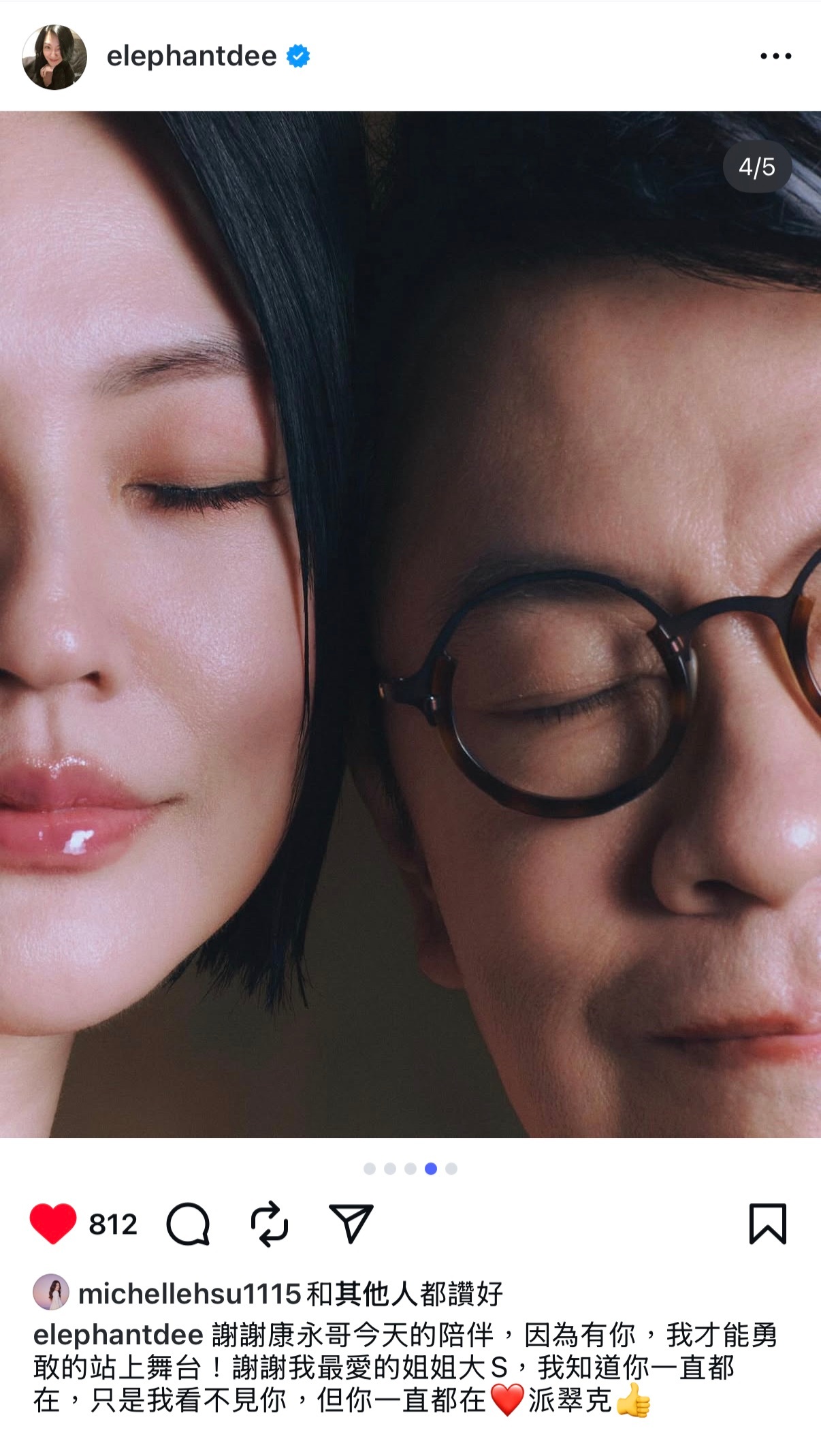 小S得奖后发文:「谢谢康永哥今天的陪伴,因为有你,我才能勇敢的站上舞台!谢谢我最爱的姐姐大S,我知道你一直都在,只是我看不見你,但你一直都在❤️派翠克👍」