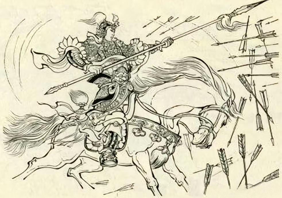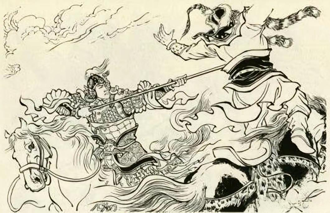 番营第一队先锋雪里花南打马往小商桥而来,碰上岳家军先锋杨再兴,雪里花南看到杨再兴单人独骑,顿时气壮熊人胆:“南蛮,还不下马受绑,等待何时?”杨再兴大怒,拍马摇枪,迎上前来,一枪挑飞雪里花南。