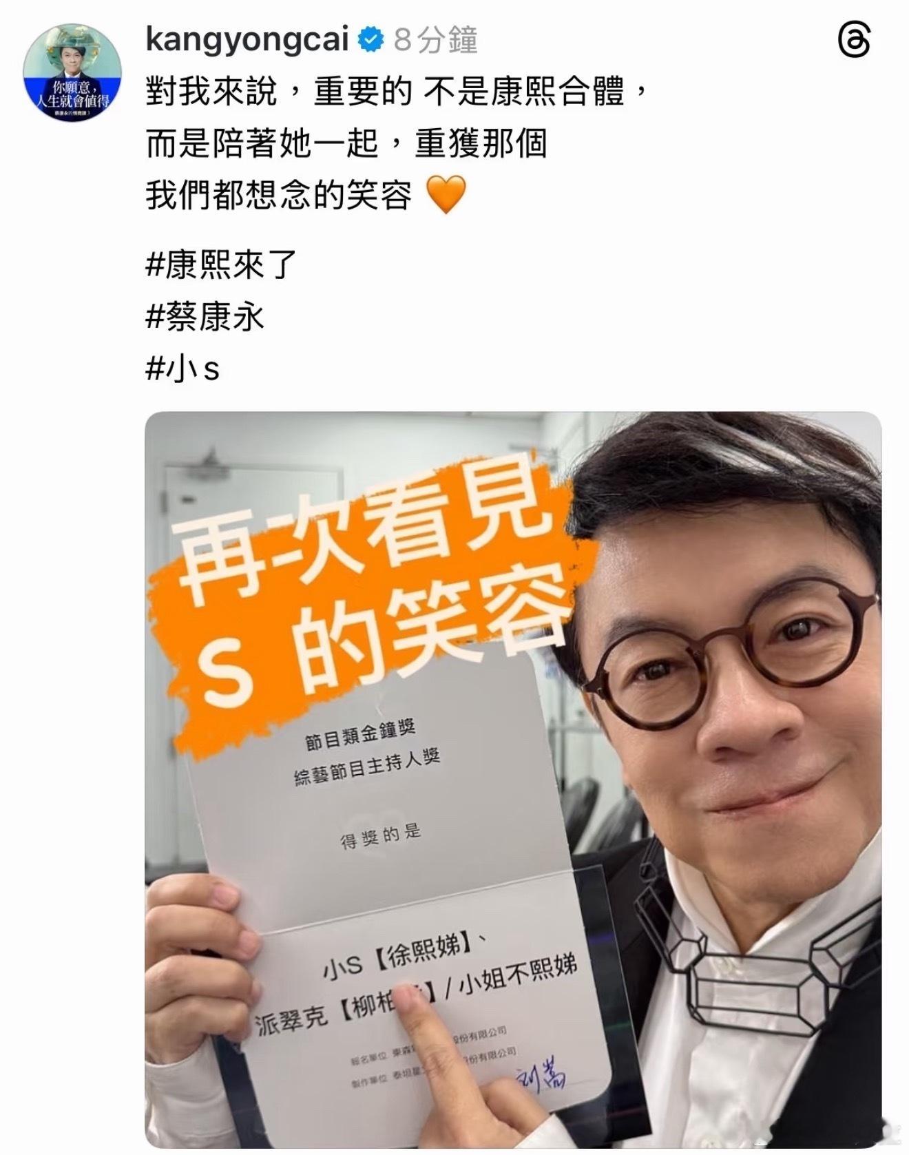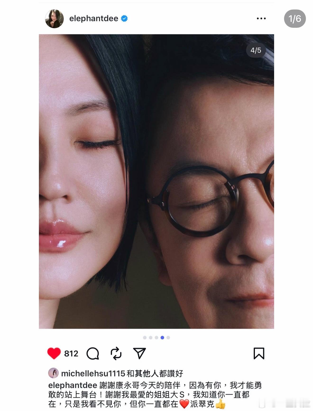 小S得:「谢谢康永哥今天的陪伴,因为有你,我才能勇敢的站上舞台!谢谢我最爱的姐姐大S,我知道你一直都在,只是我看不見你,但你一直都在❤️派翠克👍