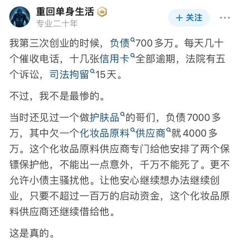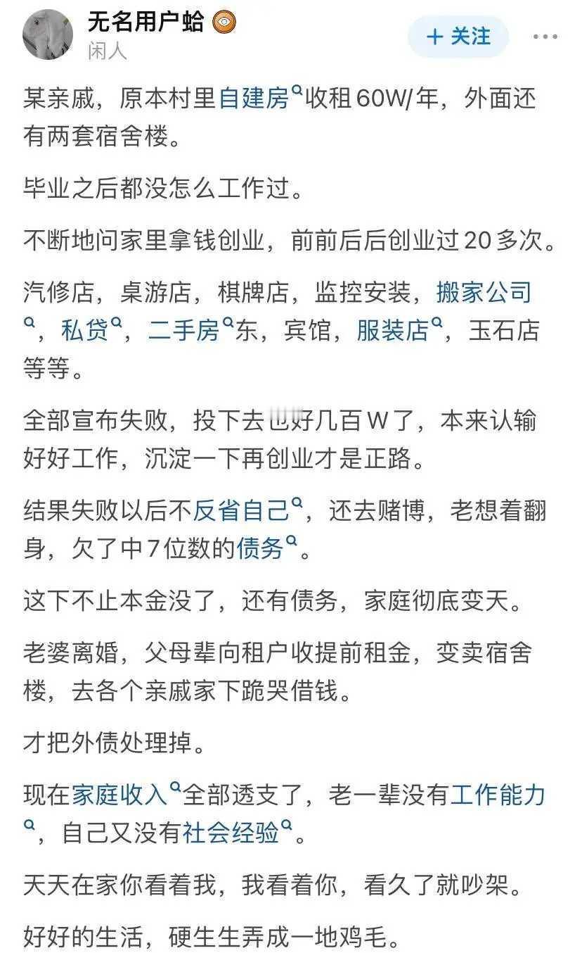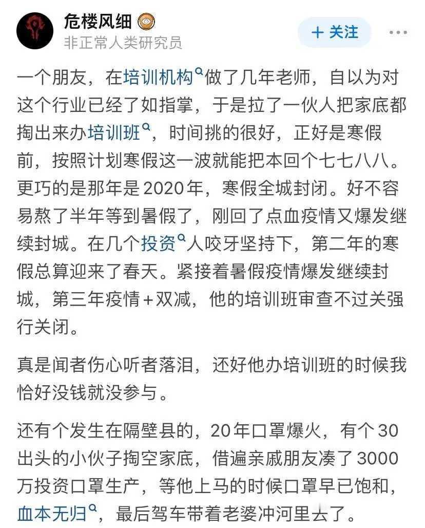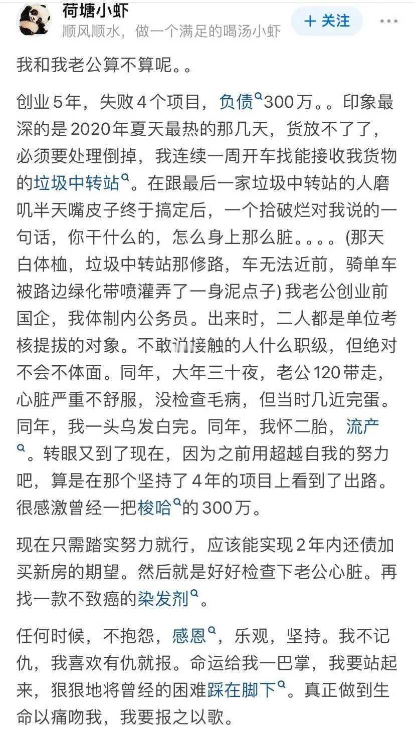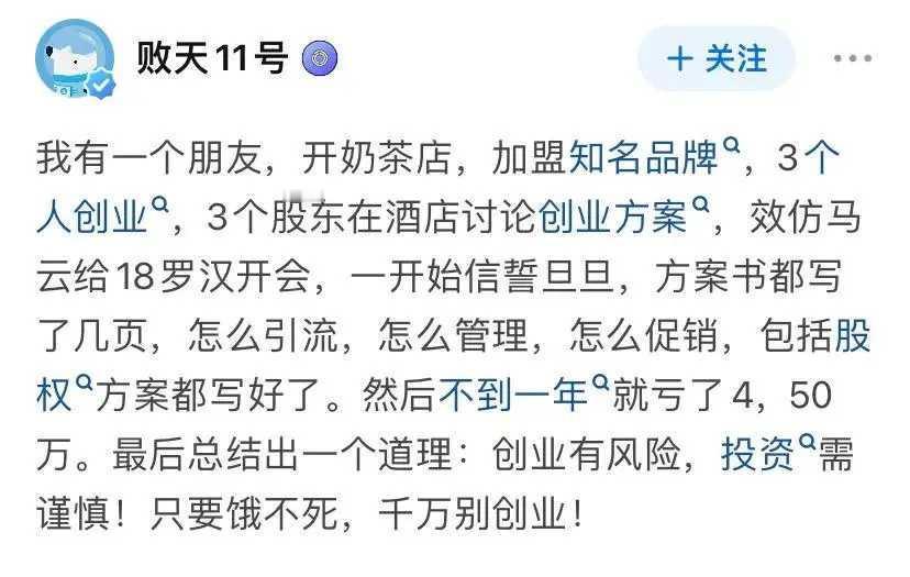 “曾经在武汉有九套房,创业开设计公司后,一套没剩。”近日,“你身边有创业失败很惨的人吗”话题在社交平台引发热议,上千名网友分享亲身经历,有人从稳定国企辞职后赔光积蓄,有人囤货遇疫情血本无归,也有人负债几十万后靠跑美团、烤面筋重新站起,字里行间的血泪与挣扎,戳中无数人的心。 “别拿稳定换‘赌徒式’创业,我用20万买了教训。”一位网友回忆,自己曾是国企员工,手握旁人羡慕的“铁饭碗”,却总觉得“日子太安逸”。2019年不顾家人反对辞职,先加盟餐饮品牌,后合伙开汽车美容店,没摸清行业规律就盲目投入,不到两年赔光20多万积蓄。“最惨时不敢回家,怕看到老婆孩子的眼神,最后在夜市支起烤面筋摊,凌晨三点收摊,早上六点备料,才慢慢把日子拉回来。”如今他拒绝所有“创业机会”,守着小摊子,“小钱不断、家庭和睦,比啥都强”。 有人栽在“贪心”,有人输在“心软”。做粮食贸易的网友透露,自己曾囤了大批玉米,想着年底涨价赚一笔,却因忽视保存条件导致粮食发霉,加上“拉不下脸在磅上做手脚”,一年直接亏损18万。“同行说我‘心太软’,不懂得‘灵活变通’,可我要是真那么做了,夜里都睡不安稳。”他感慨,“创业不是比谁狠,是我既没算好风险,又高估了自己的能力,认输不丢人。” 疫情成了不少创业者的“意外暴击”。一位网友的朋友瞄准高端礼品市场,年前推出海鲜大礼包,首批货靠送礼需求快速售罄,眼看利润可观,又砸钱囤货、定制更高端的包装盒,想趁春节再赚一波。没曾想疫情突然爆发,物流停运、礼品市场遇冷,囤下的海鲜变质,定制的包装盒堆成小山,“从‘准赢家’变成‘负债者’,只用了半个月”。 并非所有故事都是悲剧。有网友分享老板的经历:搞农业时负债七八百万,连饭都吃不起,偶然接触老鼠外贸行业,靠着老外客户先付的货款“起死回生”,三年时间还清债务彻底翻身;还有人负债22万后,一边跑美团外卖,一边做月入一千多的小生意,七个多月还了4万多,“每天累得沾床就睡,但知道每一分钱都在还债,心里踏实”。 “创业像走钢丝,该冒进时要敢闯,该保守时别硬撑。”一位曾在地产行业摸爬滚打九年、2017年组队创业的网友总结,自己经历过2019年的高峰,也扛过口罩三年的低谷,“有时手握3万预算,吃饭只花2000;有时兜里只剩1万,却得咬牙投5万。”他坦言,创业没有固定公式,“不看你有多努力,只看结果能不能活下来,但没有一次次试错的过程,也不会有后来的‘活着’”。 话题下,更多人留下清醒的感悟:“没钱别创业,更别借钱贷款创业,失败了最多清零,别让自己负债累累”“稳定的工作不是‘苟且’,是给家人的保障”“创业不是‘赌一把’,是算清楚风险后的决定”。这些带着温度与痛感的分享,没有鸡汤,只有真实,或许正是对“要不要创业”最实在的回答。
